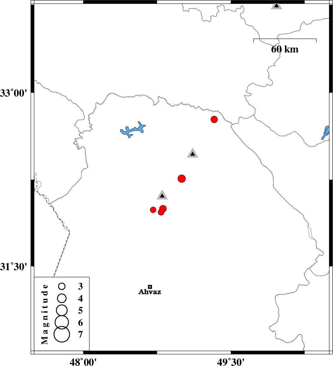 | 2007/09/10 | 21:18:57.1 | 00:48:57.1 | 31.99 | 48.71 | 4 | ML:2.7 | 14 km West of Shushtar, Khoozestan Province | ||