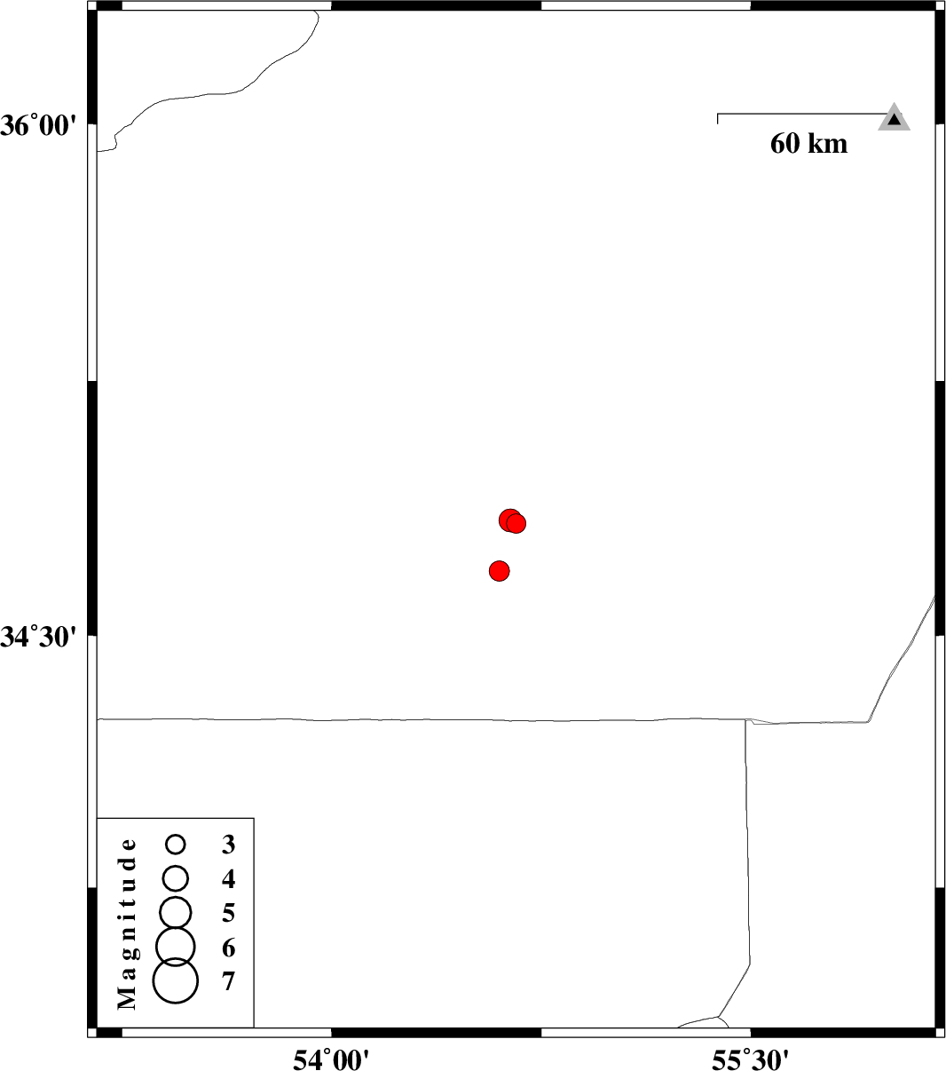 | 2007/07/26 | 04:07:32.9 | 07:37:32.9 | 34.69 | 54.6 | 14 | ML:3.3 | 146 km South-East of Semnan, Semnan Province | ||