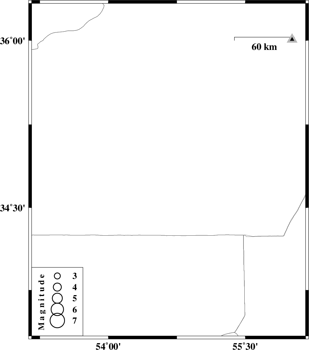 | 2007/08/16 | 23:41:09.7 | 03:11:09.7 | 34.83 | 54.66 | 18 | ML:3.1 | 140 km South-East of Semnan, Semnan Province |