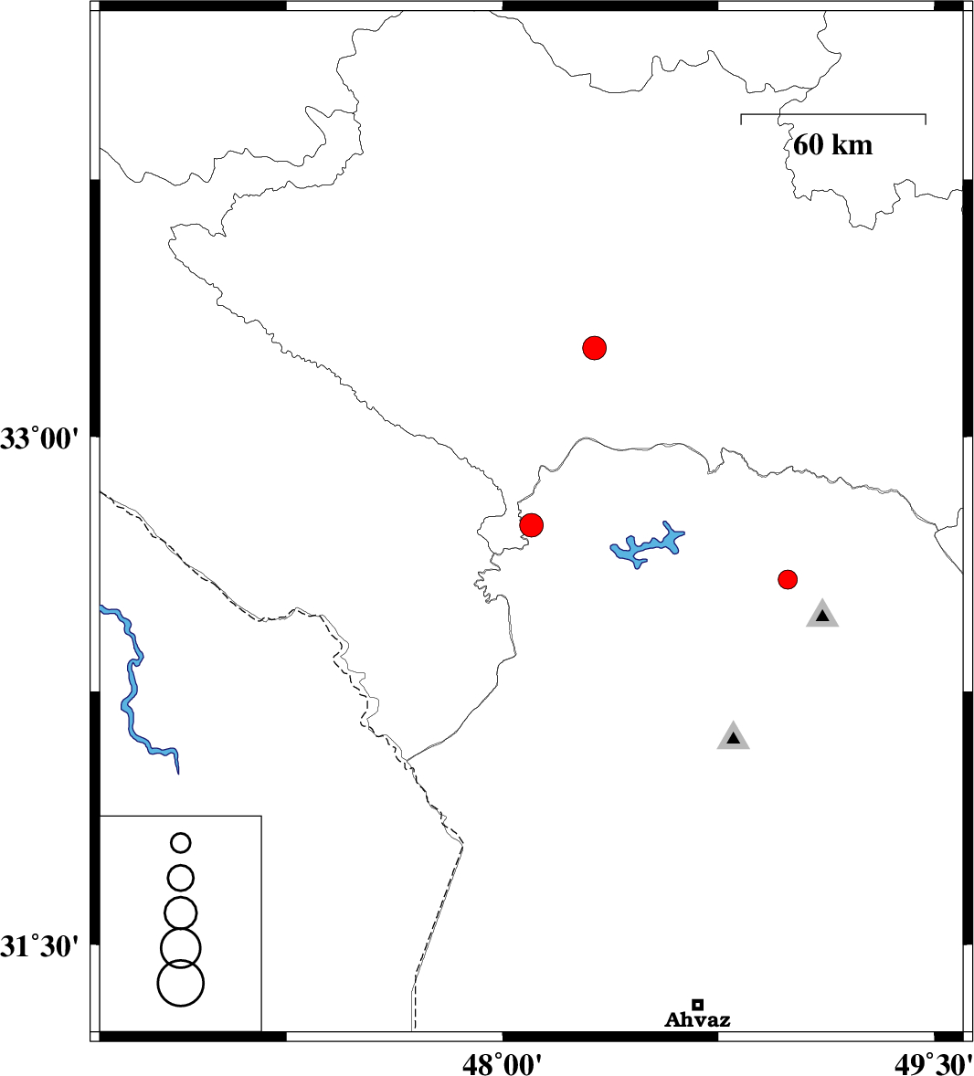 2007/08/17 | 22:46:16.7 | 02:16:16.7 | 32.74 | 48.1 | 14 | ML:3.6 | 38 km North-West of Andimeshk, Khoozestan Province | ||