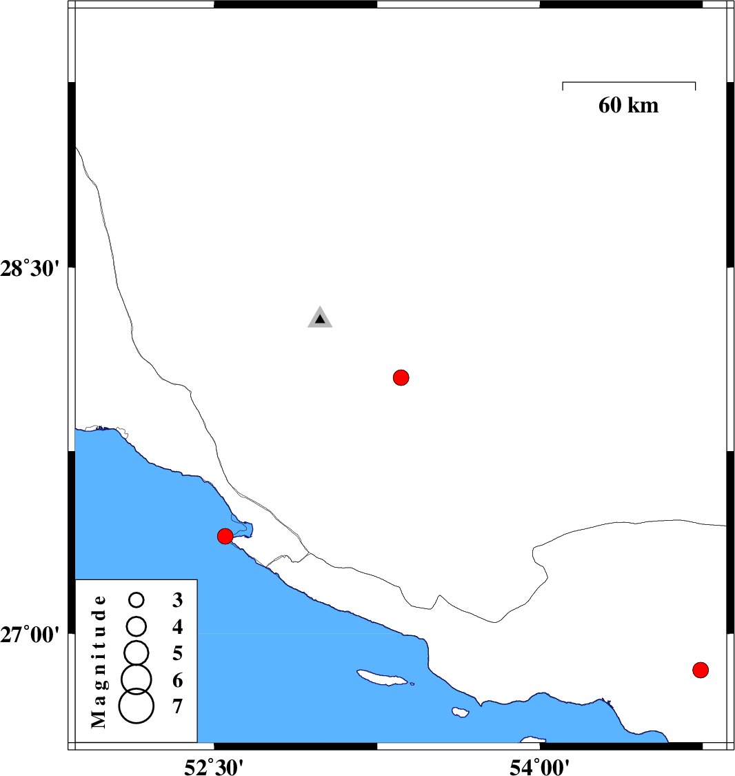 | 2007/07/27 | 02:29:50.7 | 05:59:50.7 | 27.4 | 52.55 | 26 | ML:3.2 | Persian Gulf, 37 km South-West of Mehr |