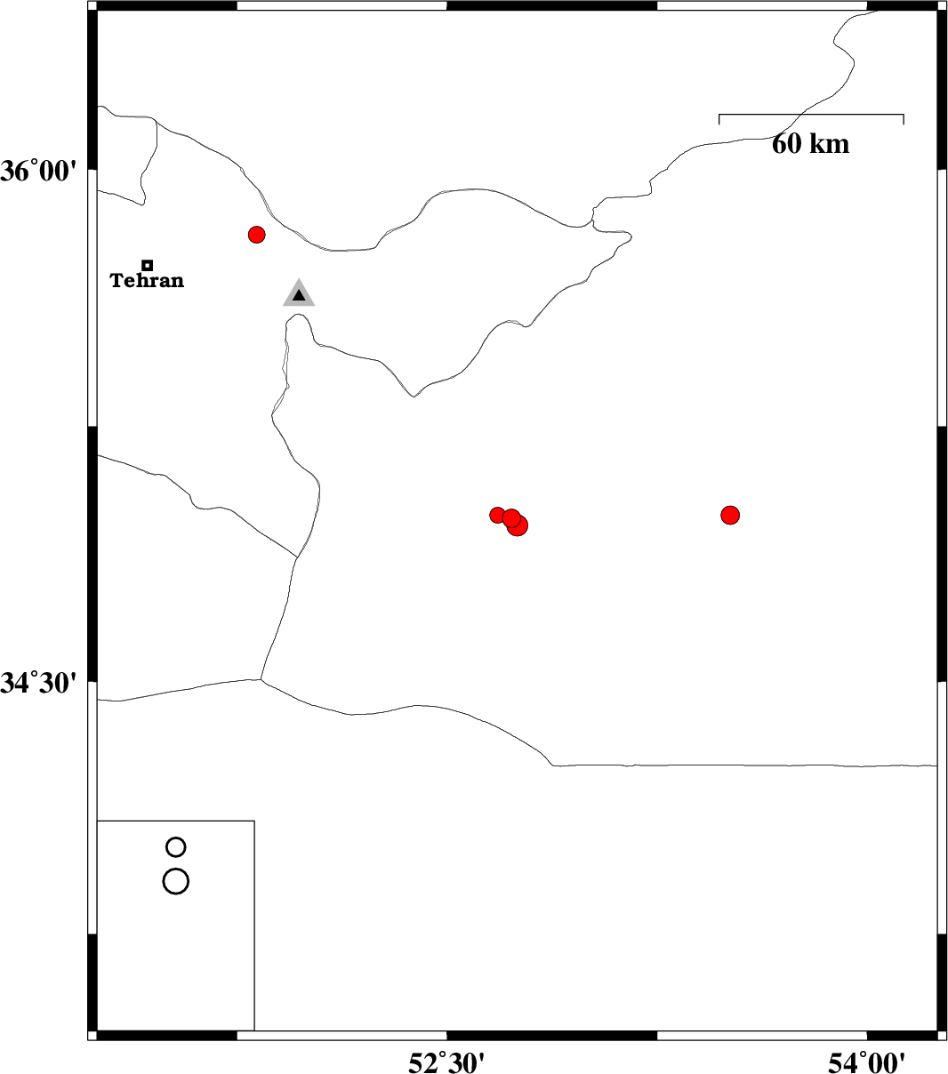 | 2007/09/15 | 07:01:16.8 | 10:31:16.8 | 35.81 | 51.82 | 18 | ML:2.7 | 25 km West of Damavand, Tehran Province | ||