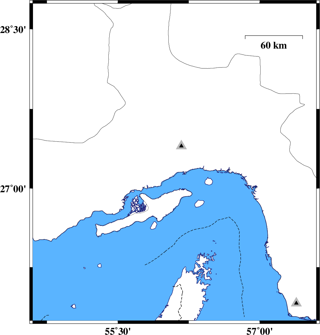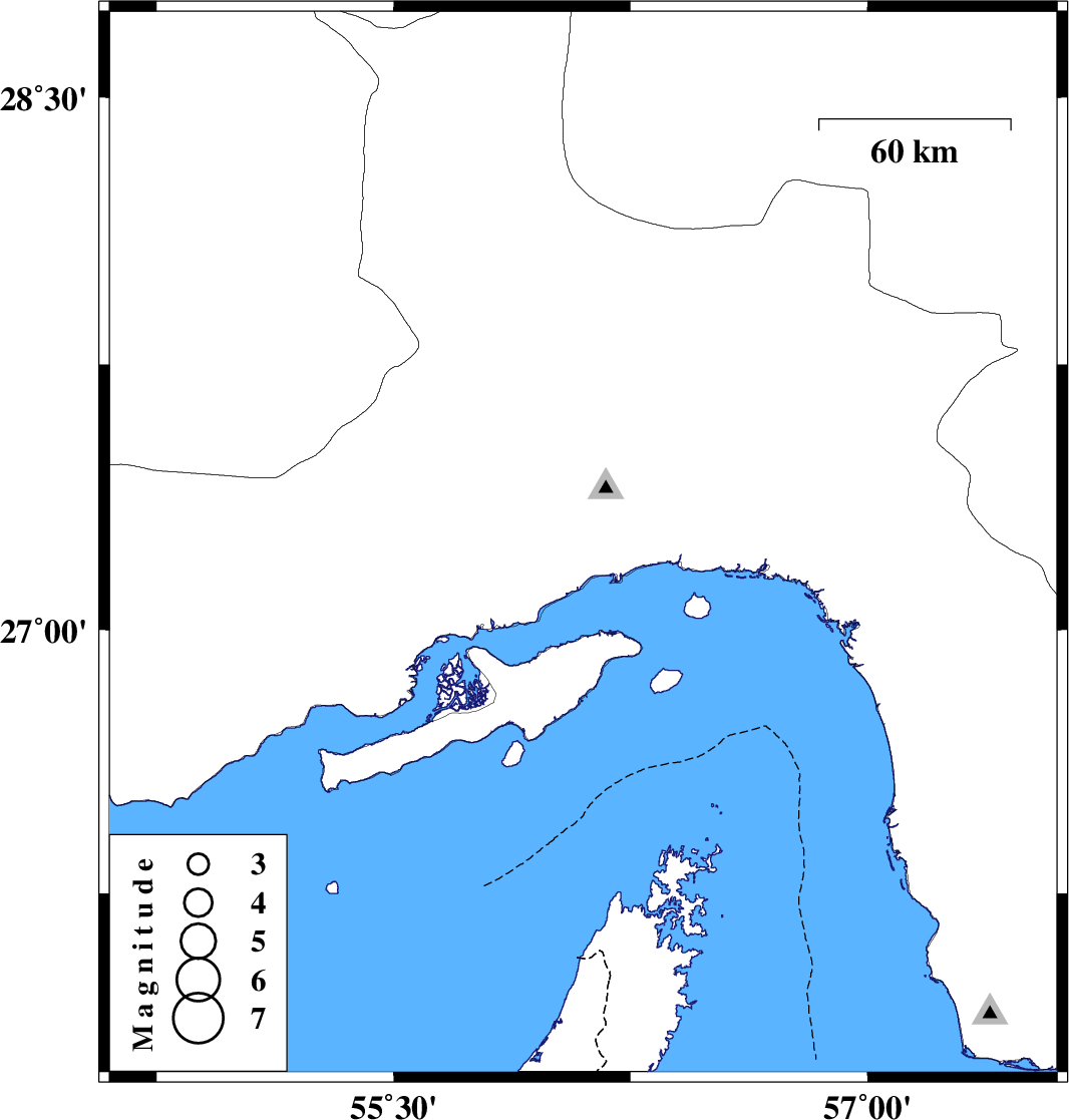 | 2007/09/23 | 21:06:07.6 | 00:36:07.6 | 27.24 | 56.1 | 41 | ML:3.2 | 18 km West of Bandar-e abbas, Hormozgan Province |
