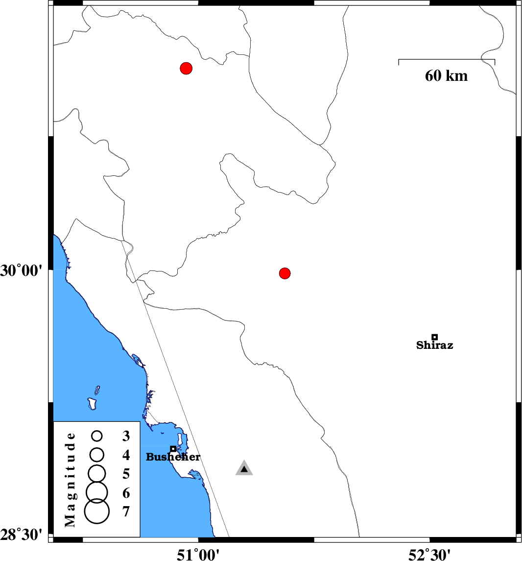 | 2007/07/24 | 01:01:23.6 | 04:31:23.6 | 29.98 | 51.56 | 15 | ML:3.2 | 14 km South of Nurabad, Fars Province | ||