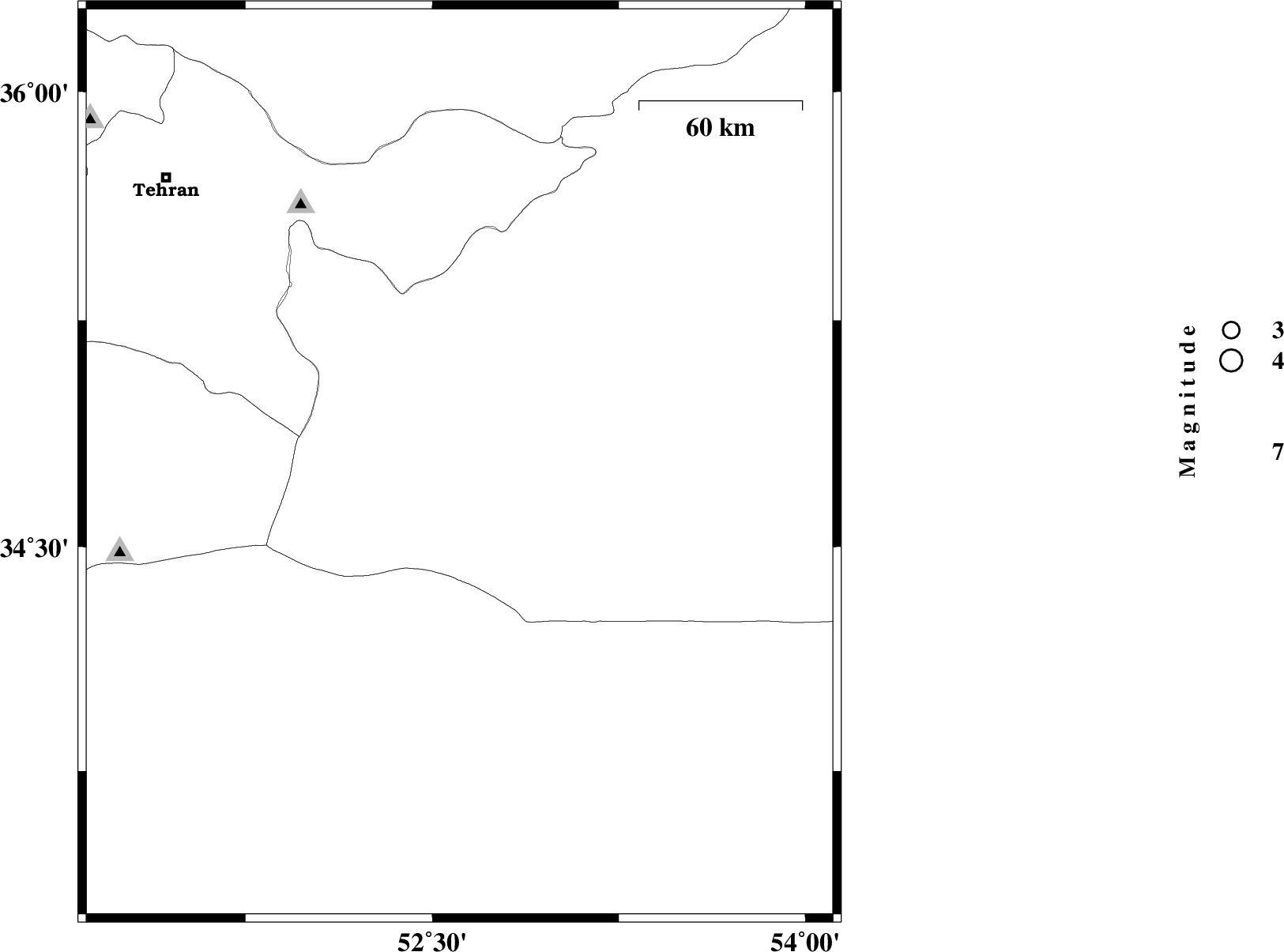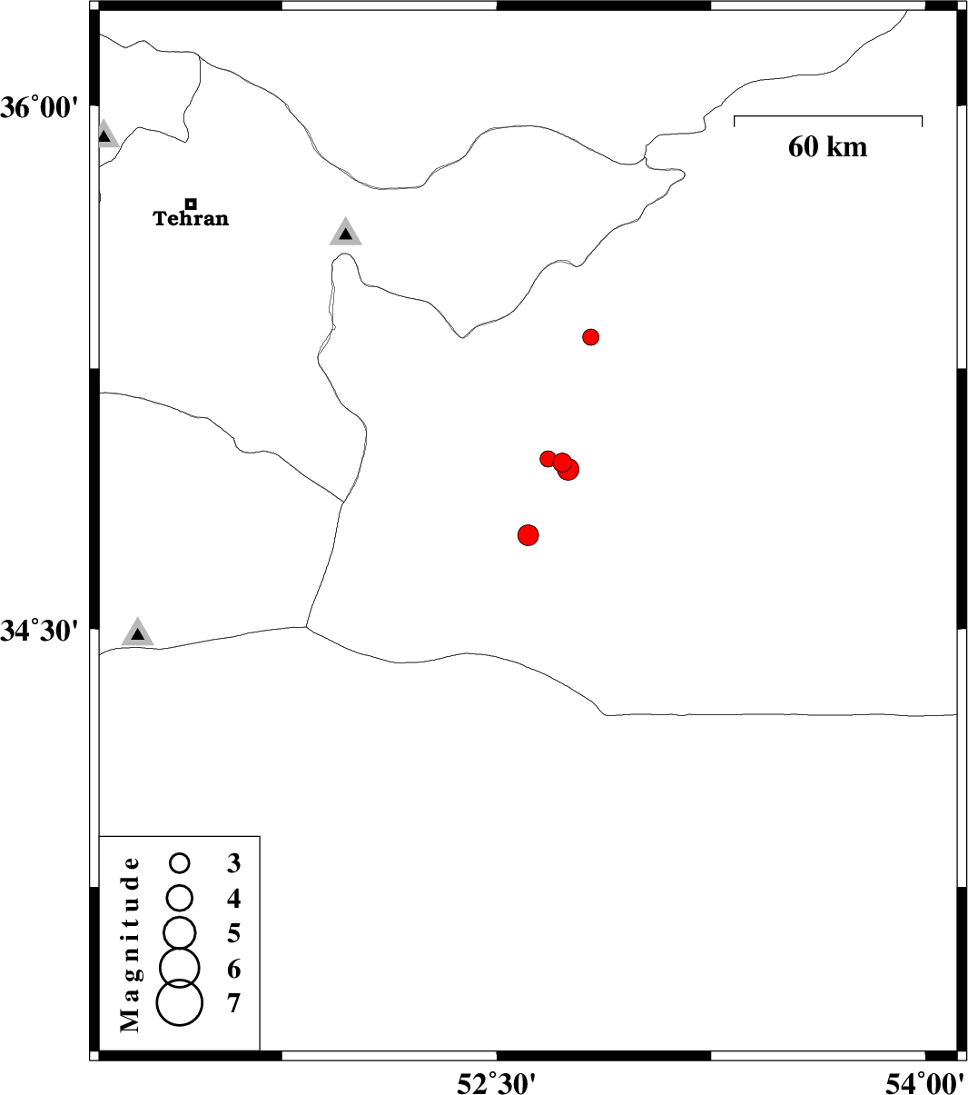 | 2007/09/19 | 06:02:33.1 | 09:32:33.1 | 34.99 | 52.68 | 15 | ML:2.5 | 40 km South-East of Garmsar, Semnan Province |