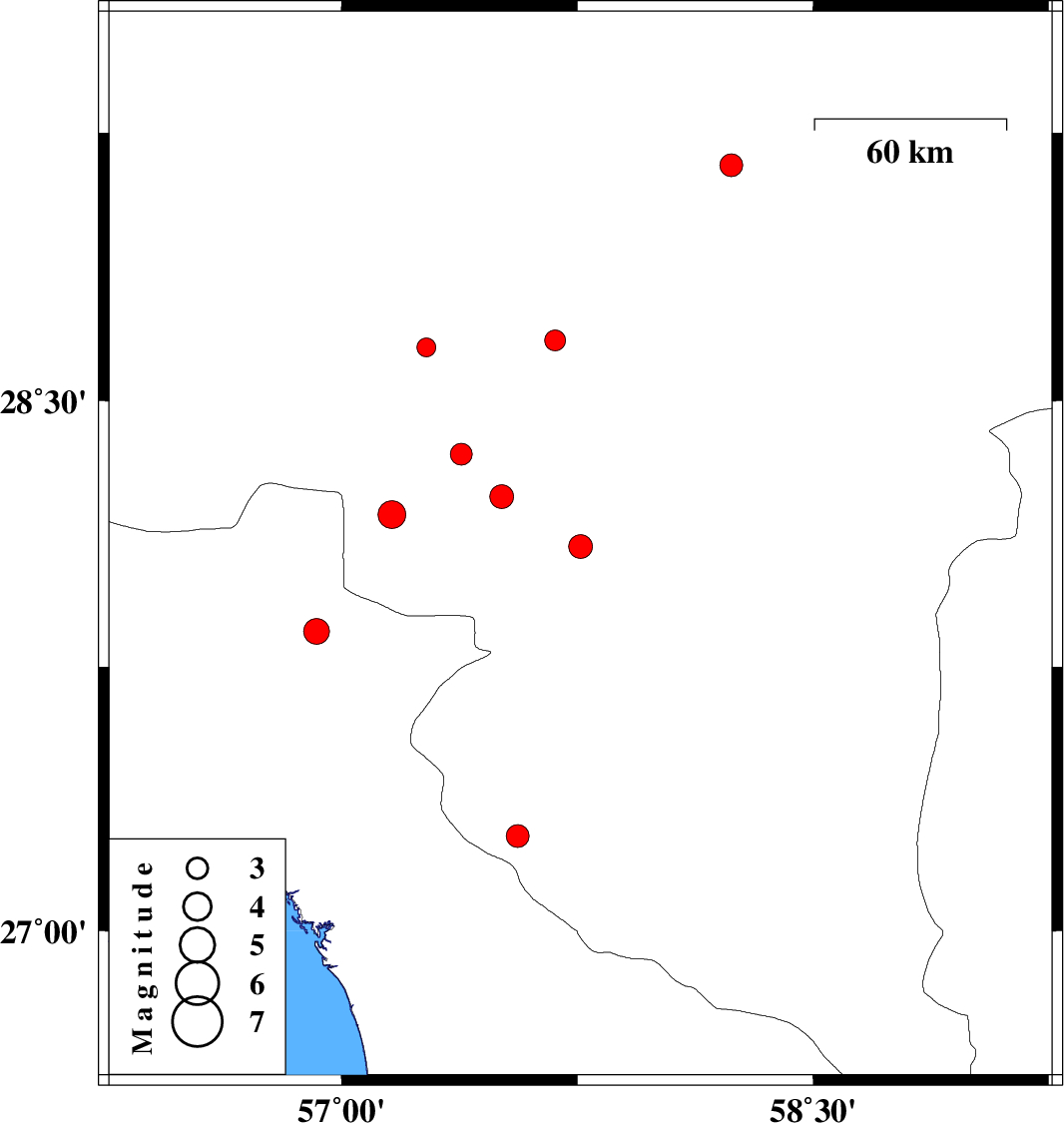 | 2007/06/26 | 20:48:59.0 | 00:18:59.0 | 28.23 | 57.51 | 14 | ML:3.4 | 36 km North-West of Kahnuj, Kerman Province |