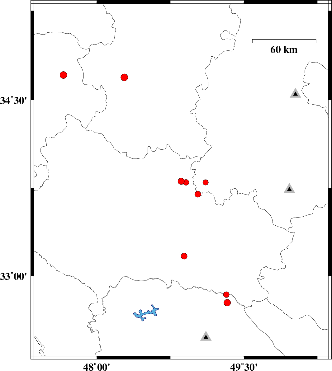 2007/08/27 | 03:49:33.3 | 07:19:33.3 | 33.7 | 49.03 | 44 | ML:2.8 | 24 km North of Dorud, Lorestan Province |