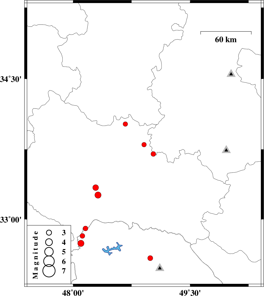 | 2007/08/14 | 17:39:55.2 | 21:09:55.2 | 33.26 | 48.32 | 39 | ML:3.6 | 25 km South of Khorramabad, Lorestan Province | ||