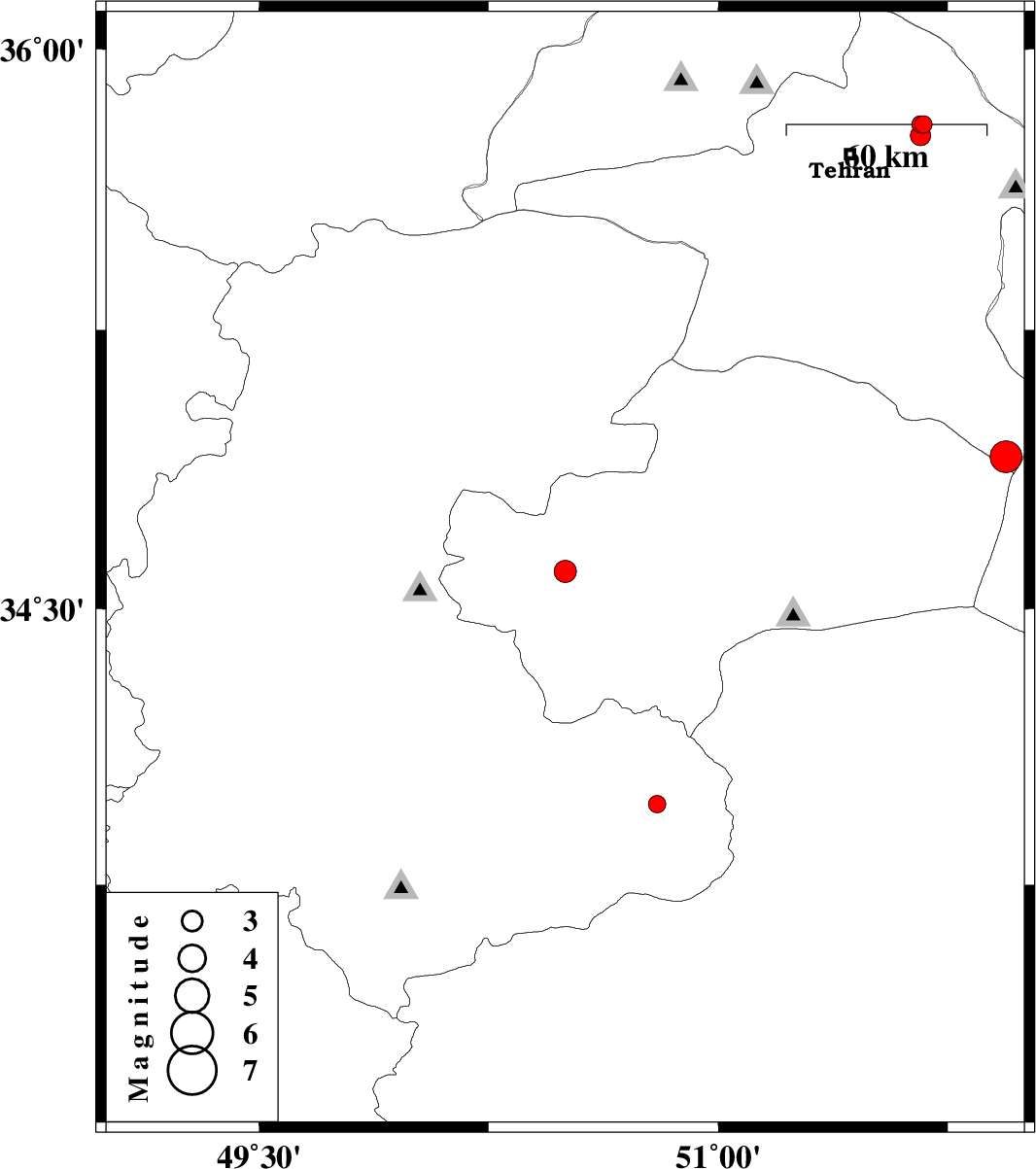 | 2007/08/25 | 10:07:35.3 | 13:37:35.3 | 34.91 | 51.94 | 24 | ML:4.6 | 50 km South-West of Garmsar, Semnan Province | ||