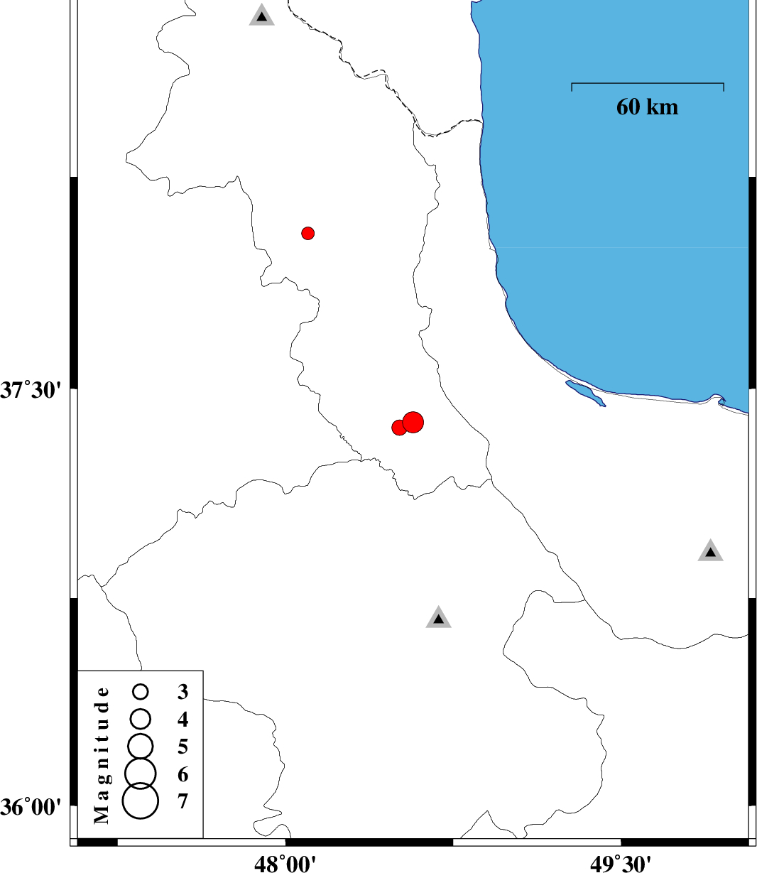 | 2007/09/29 | 09:28:32.3 | 12:58:32.3 | 38.05 | 48.1 | 14 | ML:2.5 | 3 km Nir, Ardebil Province |