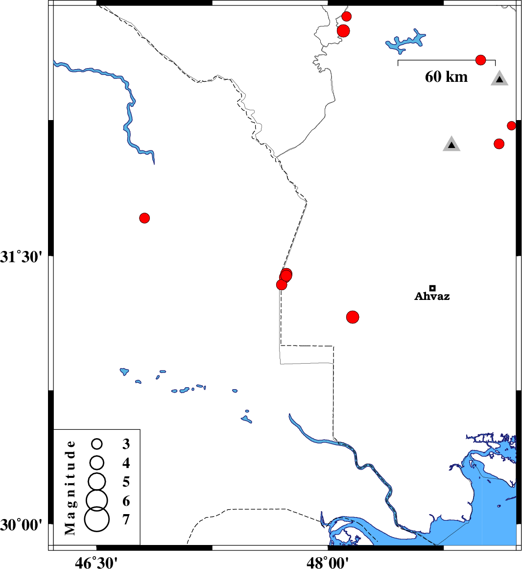 2007/08/31 02:32:34.6 06:02:34.6 31.3447.714 ML:3.1 51 km South-West of Susangerd, Khoozestan Province