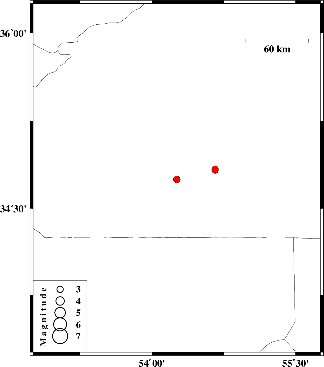 | 2007/08/16 | 23:41:09.7 | 03:11:09.7 | 34.83 | 54.66 | 18 | ML:3.1 | 140 km South-East of Semnan, Semnan Province |