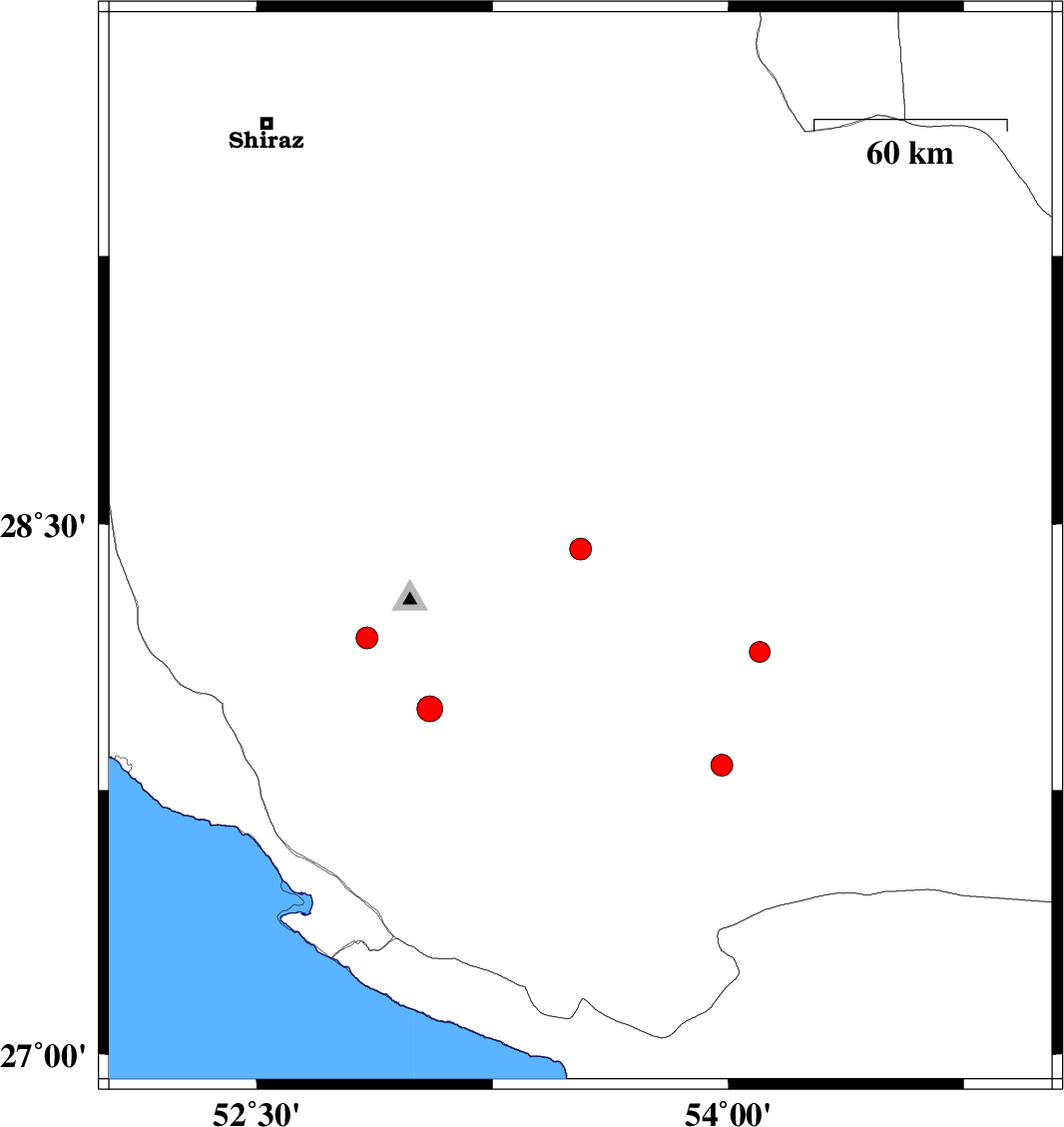 | 2007/09/05 | 02:05:32.7 | 05:35:32.7 | 27.98 | 53.05 | 18 | ML:3.6 | 50 km North-East of Mehr, Fars Province |