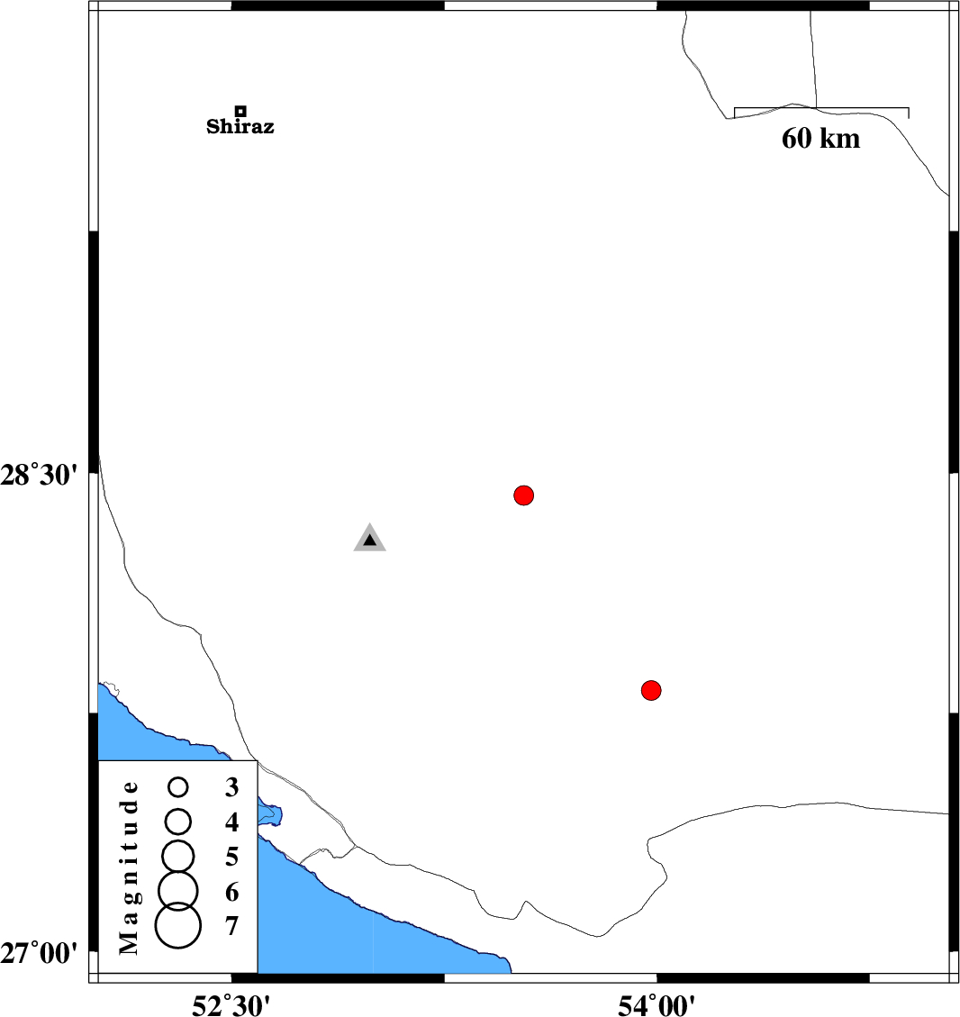 | 2007/10/02 | 05:54:02.5 | 09:24:02.5 | 27.82 | 53.98 | 14 | ML:3.1 | 38 km North-West of Lar, Fars Province |