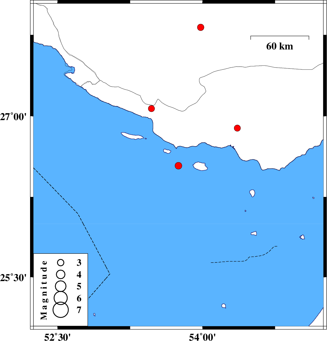 | 2007/09/18 | 04:38:54.2 | 08:08:54.2 | 26.89 | 54.36 | 35 | ML:2.9 | 34 km South of Bastak, Hormozgan Province |
