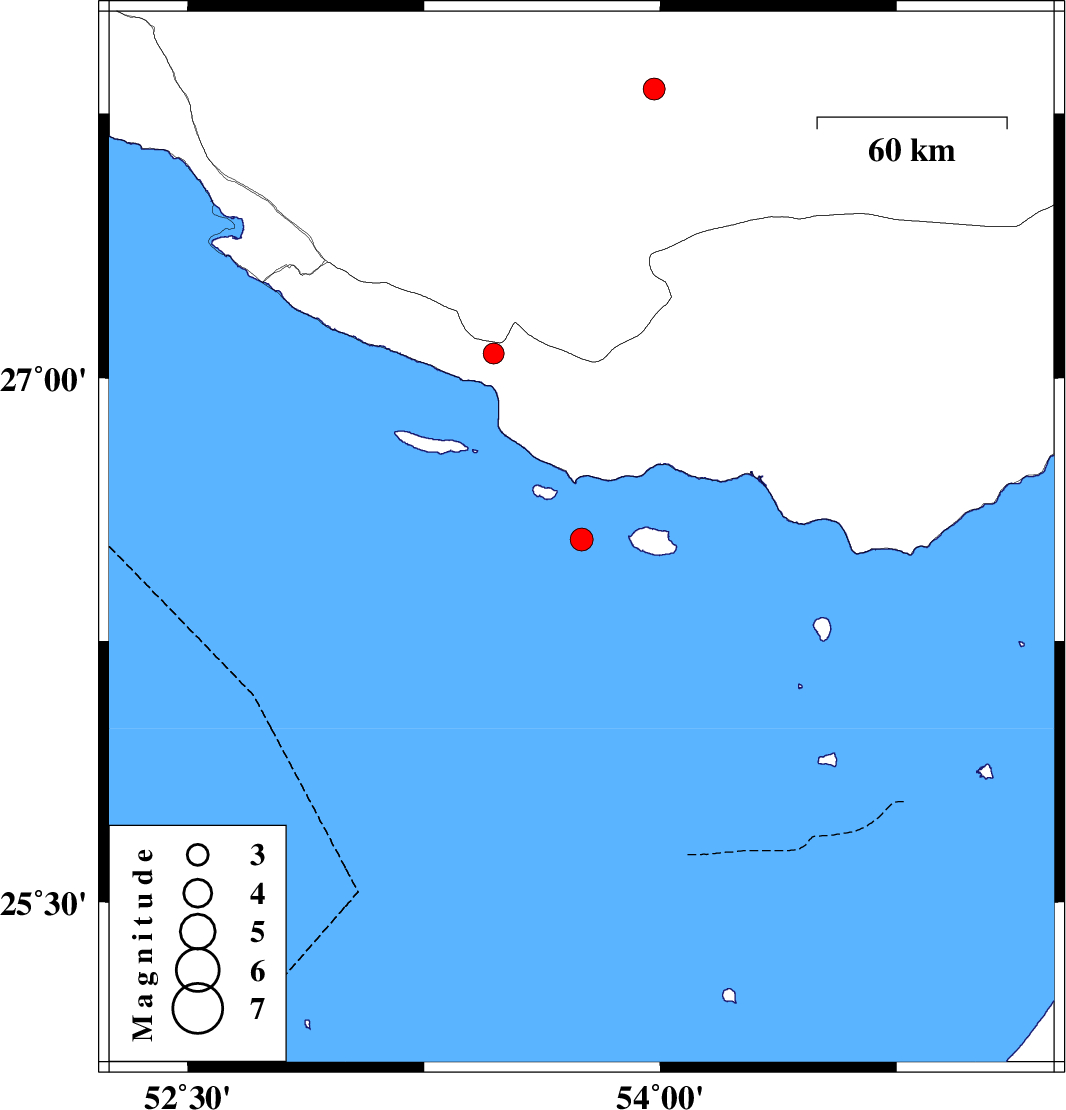 | 2007/10/06 | 15:22:34.5 | 18:52:34.5 | 26.54 | 53.75 | 18 | ML:3.2 | Persian Gulf, 94 km South-West of Bastak | ||