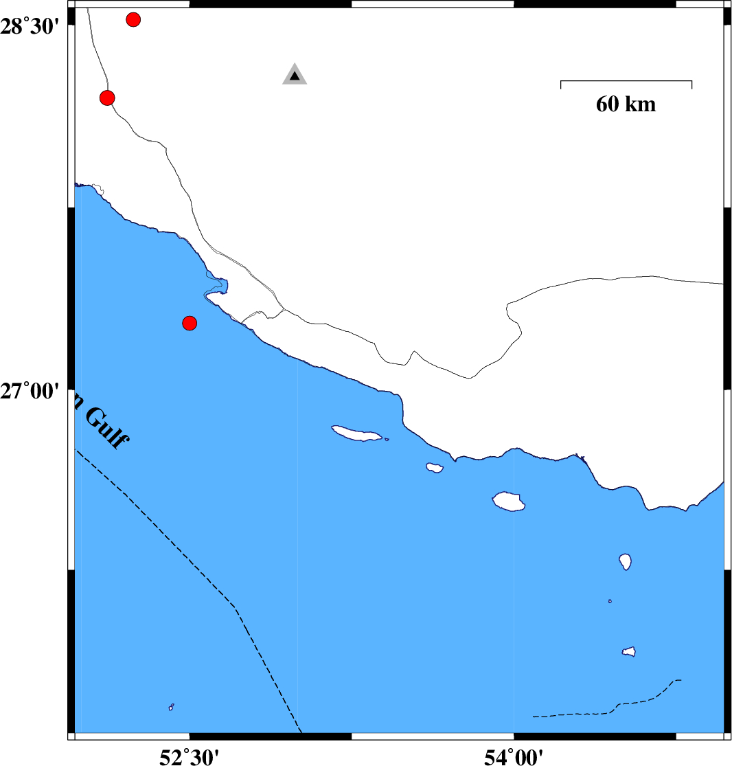 | 2007/10/06 | 15:22:34.5 | 18:52:34.5 | 26.54 | 53.75 | 18 | ML:3.2 | Persian Gulf, 94 km South-West of Bastak | ||
