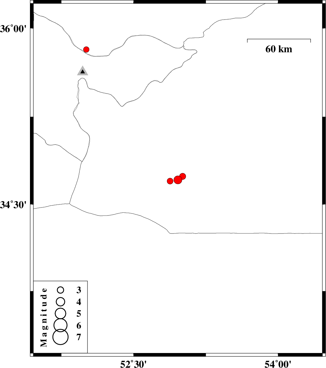 | 2007/10/08 | 02:34:52.1 | 06:04:52.1 | 34.71 | 52.96 | 18 | ML:3.8 | 79 km South-East of Garmsar, Semnan Province | ||