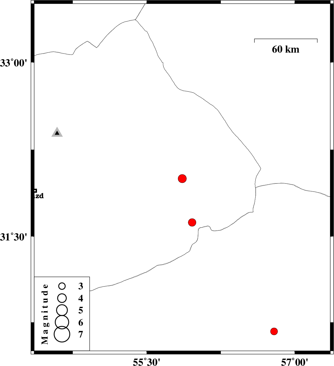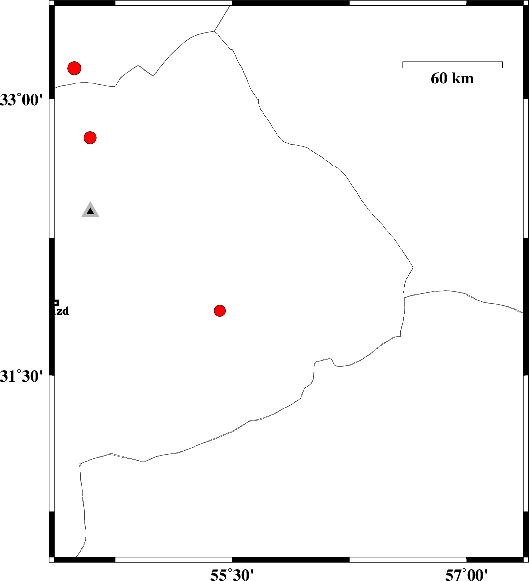 | 2007/10/17 | 10:45:02.9 | 14:15:02.9 | 32 | 55.86 | 14 | ML:3.8 | 61 km North-East of Bafq, Yazd Province | ||