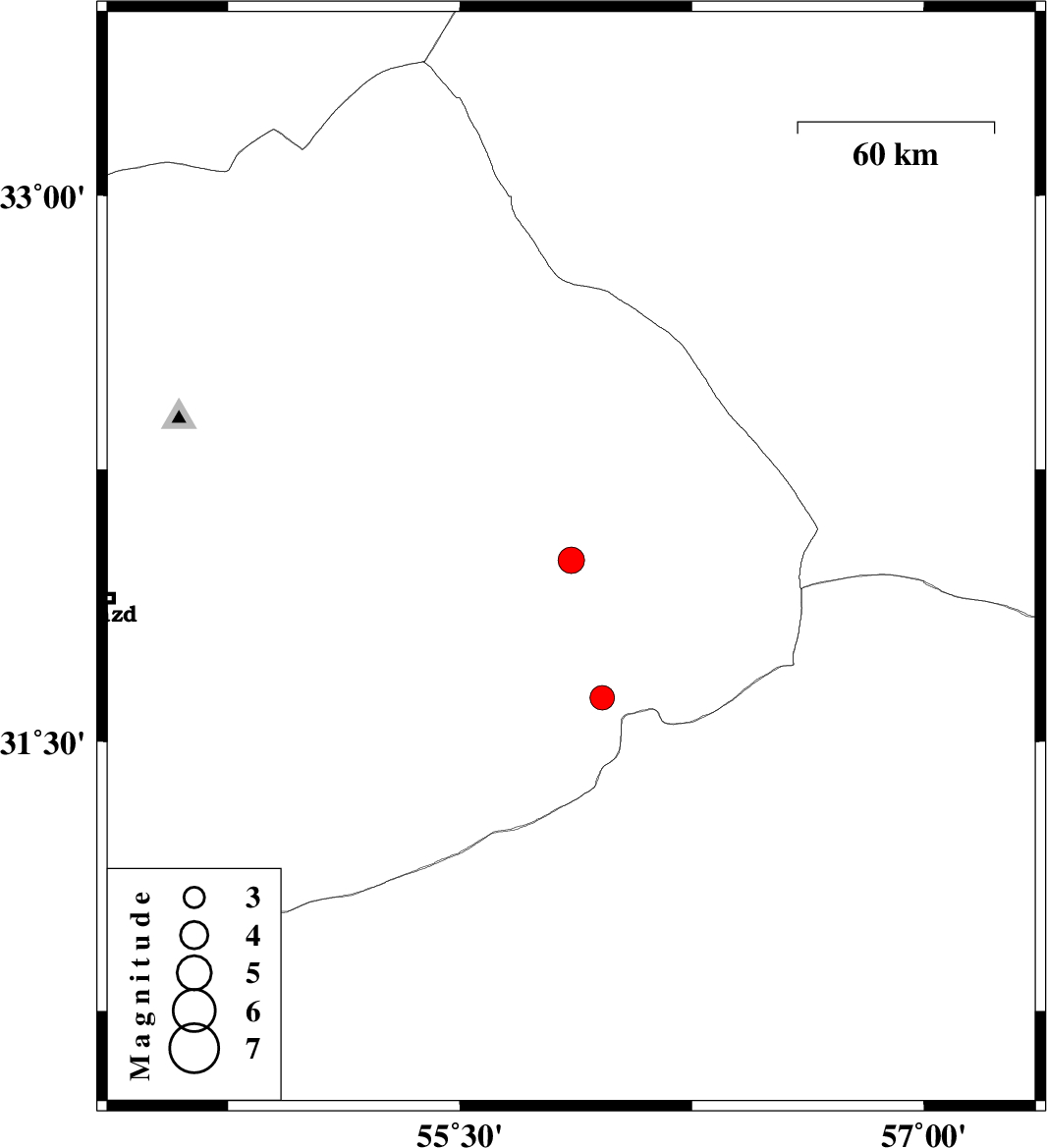 | 2007/10/17 | 10:45:02.9 | 14:15:02.9 | 32 | 55.86 | 14 | ML:3.8 | 61 km North-East of Bafq, Yazd Province | ||