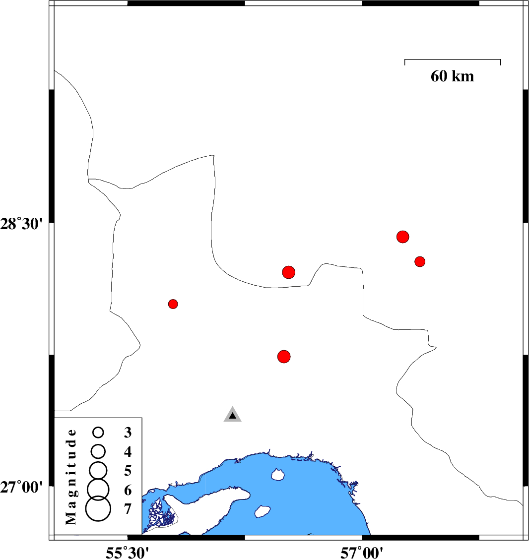 | 2007/10/15 | 00:19:01.4 | 03:49:01.4 | 28.28 | 57.37 | 36 | ML:2.9 | 48 km North-West of Kahnuj, Kerman Province | ||