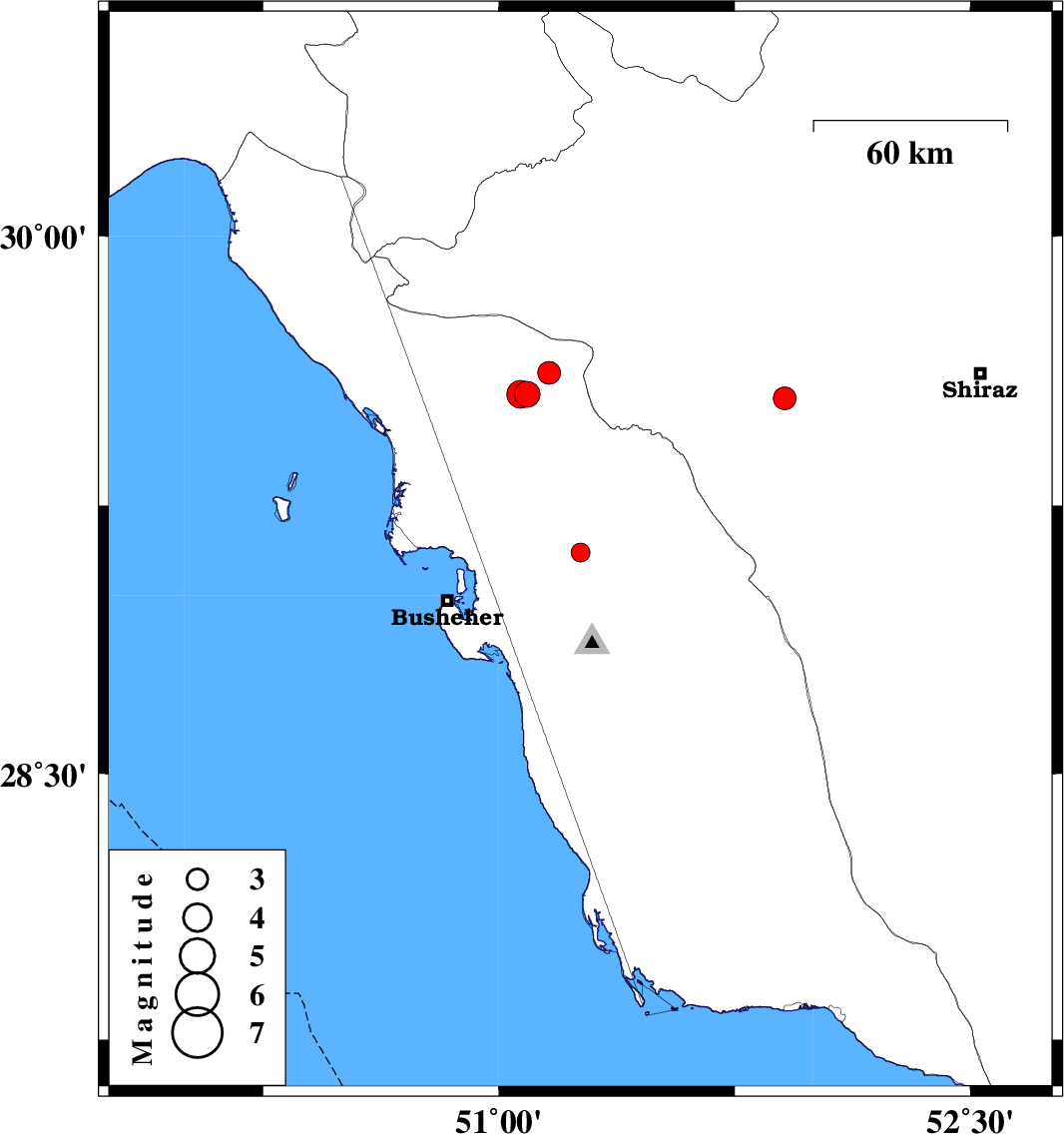 | 2007/10/22 | 02:30:59.7 | 06:00:59.7 | 29.62 | 51.16 | 14 | ML:3.2 | 40 km North of Borazjan, Bushehr Province | ||