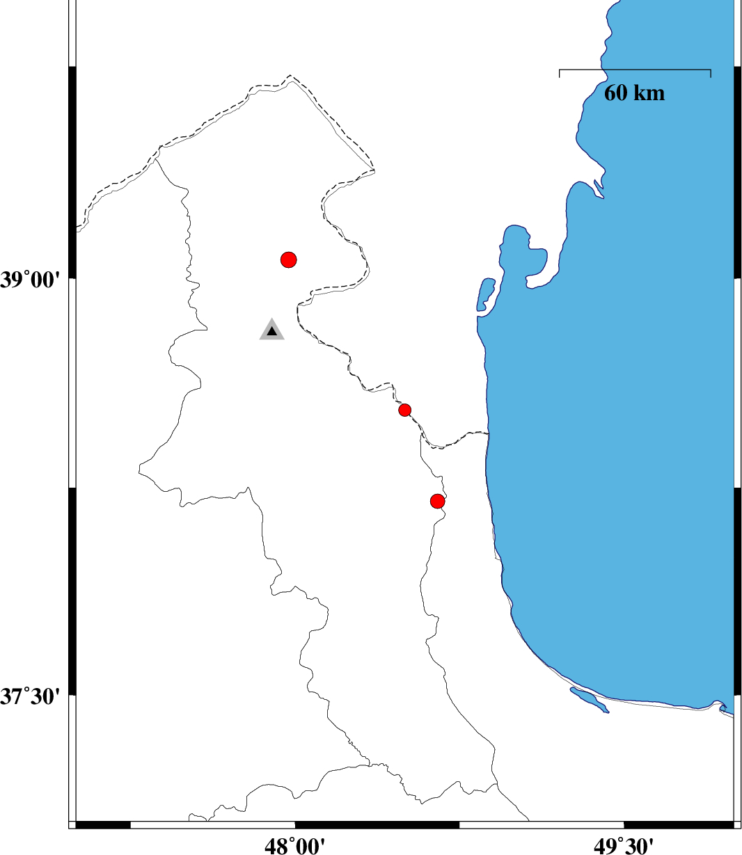 | 2007/10/20 | 01:47:56.3 | 05:17:56.3 | 37.84 | 47.35 | 14 | ML:2.6 | 20 km West of Sarab, Azarbaijan Sharghi Province |