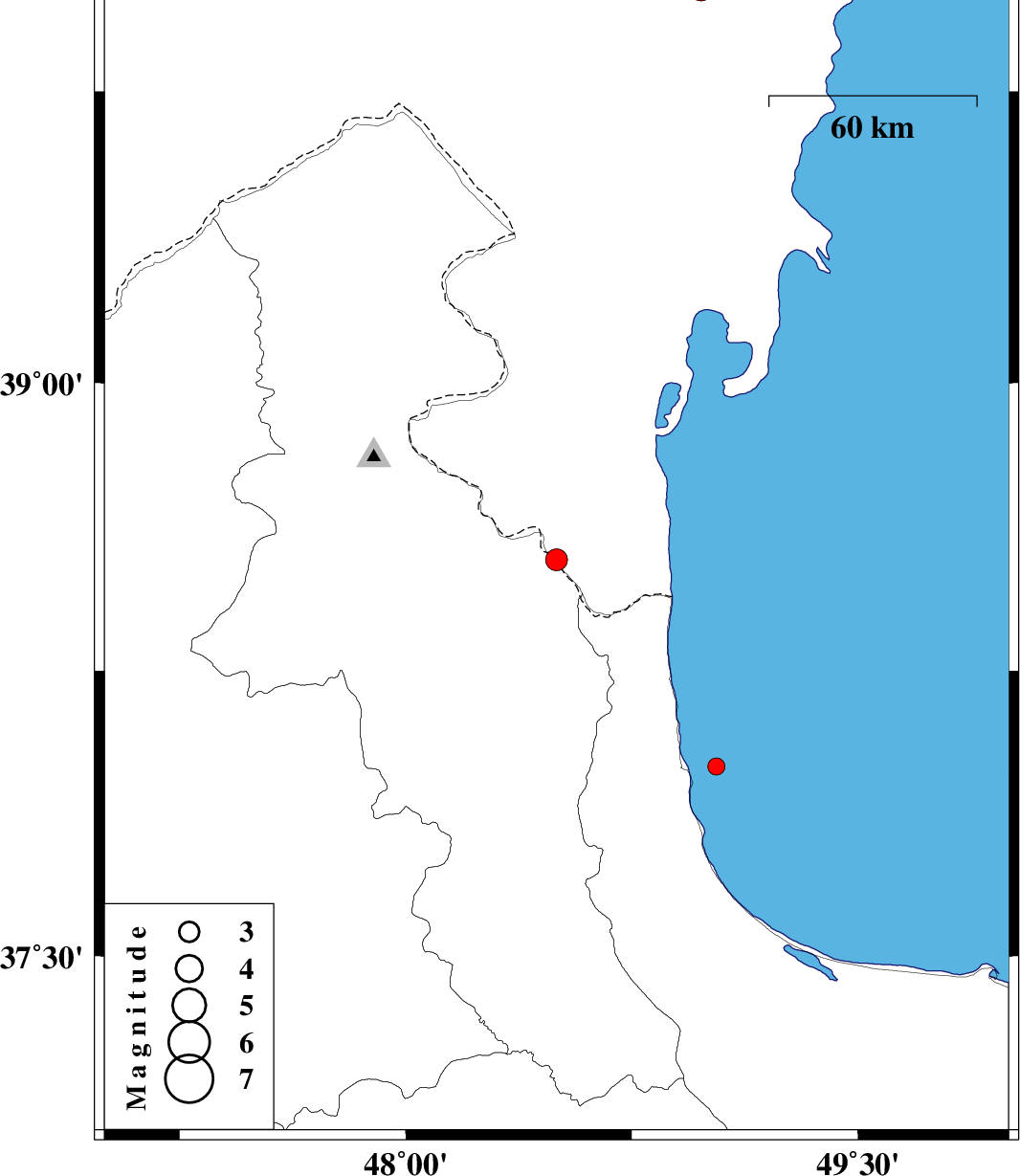 | 2007/11/05 | 22:14:41.3 | 01:44:41.3 | 38 | 49.03 | 18 | ML:2.6 | Caspian Sea, 24 km North-East of Hashtpar |