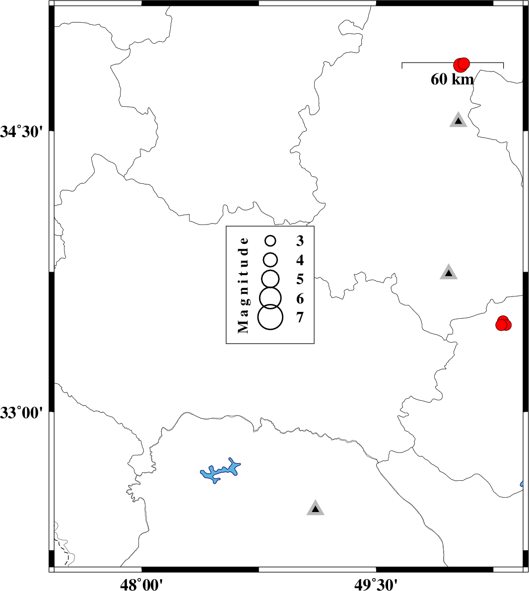 2007/11/08 | 09:45:44.5 | 13:15:44.5 | 33.67 | 48.96 | 14 | ML:3.4 | 22 km North-West of Dorud, Lorestan Province | ||