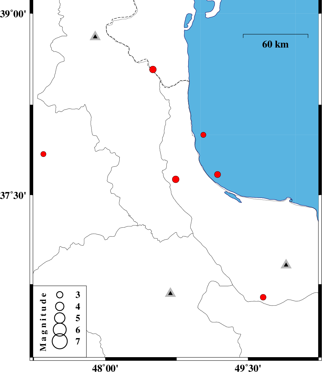| 2007/10/24 | 07:57:17.7 | 11:27:17.7 | 37.67 | 49.18 | 18 | ML:2.9 | Caspian Sea, 13 km North of Rezvanshahr | ||