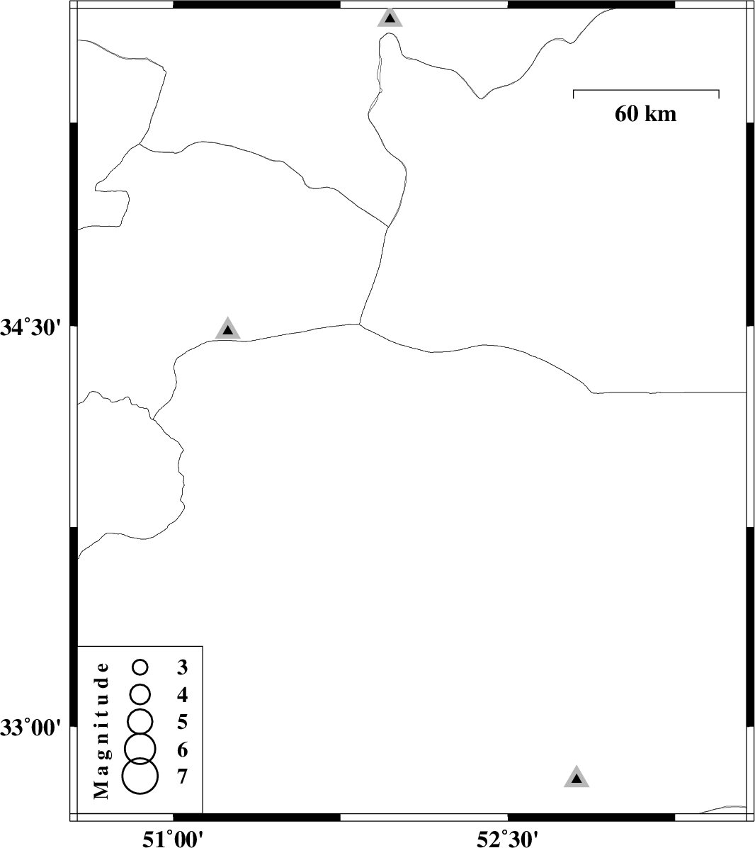 | 2007/11/13 | 21:45:14.9 | 01:15:14.9 | 34.17 | 52.07 | 39 | ML:3.2 | 56 km North-East of Aran va bidgol, Esfahan Province |