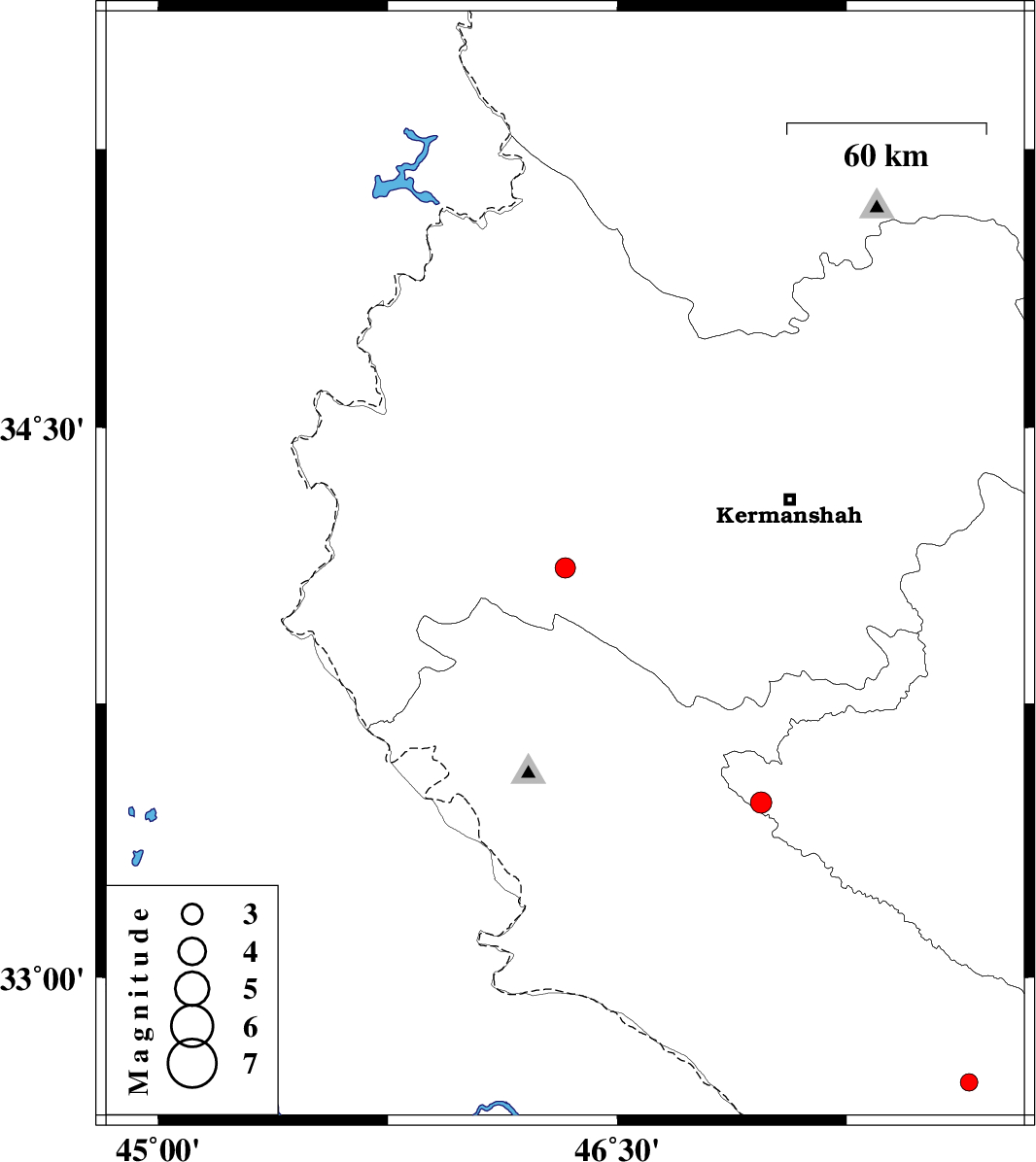 | 2007/11/14 | 08:27:44.9 | 11:57:44.9 | 34.12 | 46.33 | 18 | ML:3 | 24 km West of Eslam Abad-E-Gharb, Kermanshah Province | ||