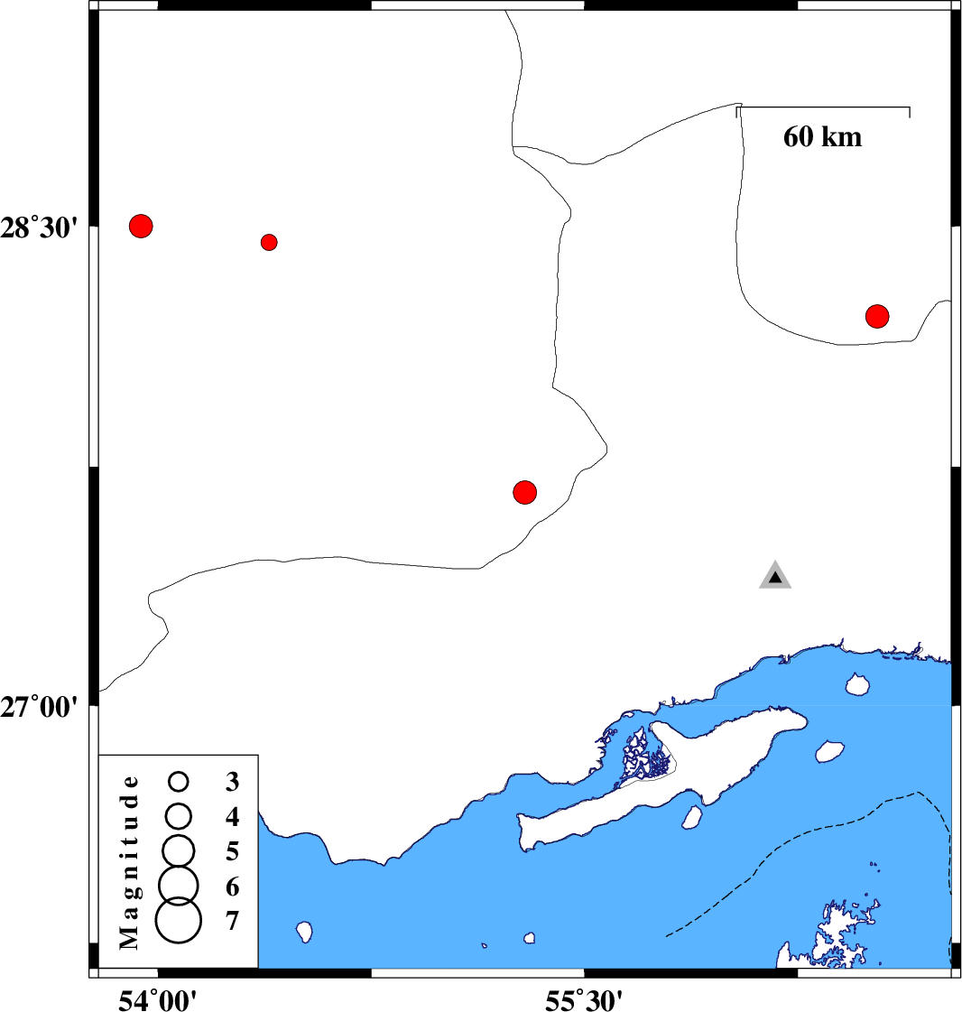 | 2007/11/11 | 23:23:51.6 | 02:53:51.6 | 28.5 | 53.94 | 14 | ML:3.7 | 37 km East of Jahrom, Fars Province | ||