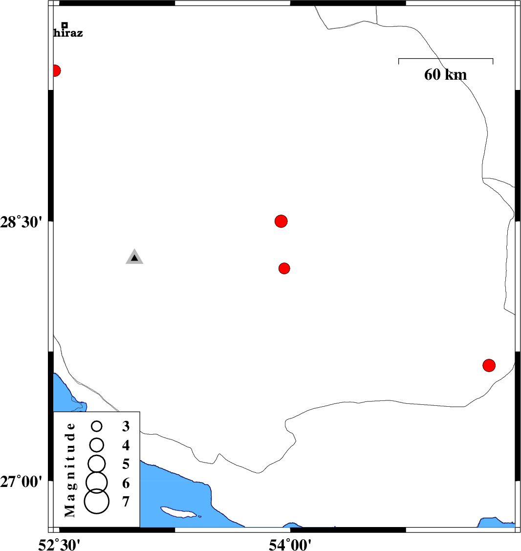 | 2007/11/15 | 02:37:41.1 | 06:07:41.1 | 29.36 | 52.47 | 46 | ML:3.4 | 29 km South of Shiraz, Fars Province | ||
