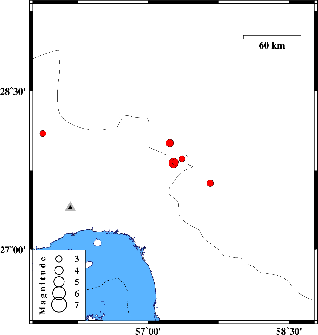 | 2007/10/31 | 22:15:26.1 | 01:45:26.1 | 27.63 | 57.66 | 35 | ML:3.3 | 28 km North-East of Manujan, Kerman Province |