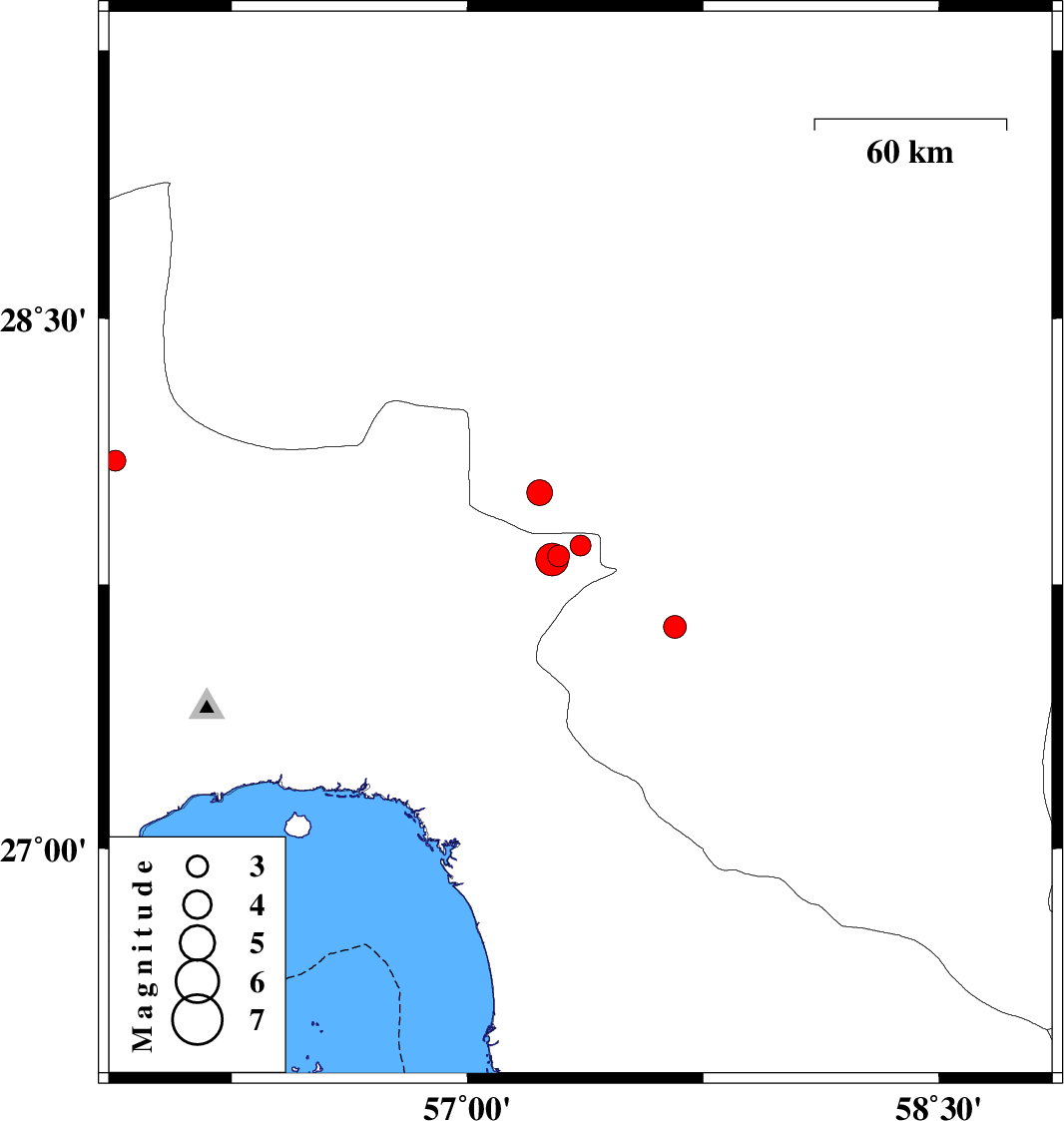 | 2007/11/18 | 18:37:50.3 | 22:07:50.3 | 27.83 | 57.29 | 44 | ML:3.1 | 42 km South-West of Kahnuj, Kerman Province | ||