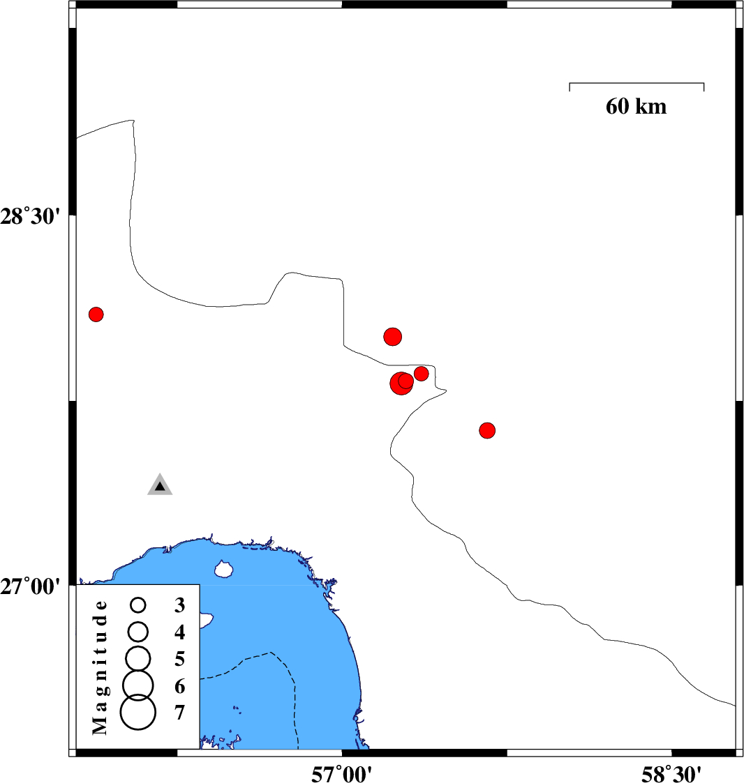 2007/11/18 18:37:50.3 22:07:50.3 27.8357.2944 ML:3.1 42 km South-West of Kahnuj, Kerman Province