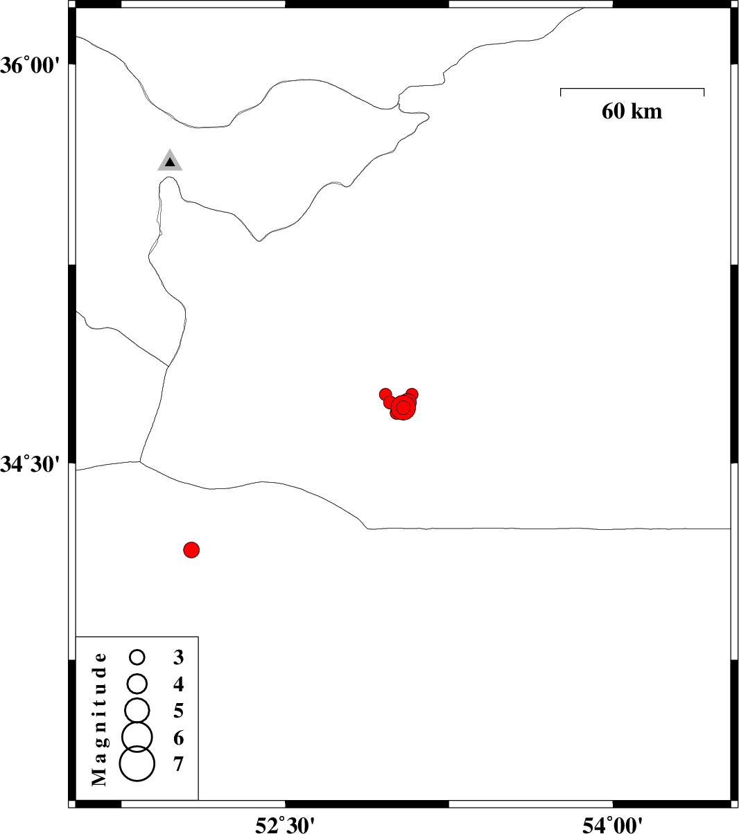 2007/11/19 16:58:48.3 20:28:48.3 34.7352.9827 ML:2.7 80 km South-East of Garmsar, Semnan Province