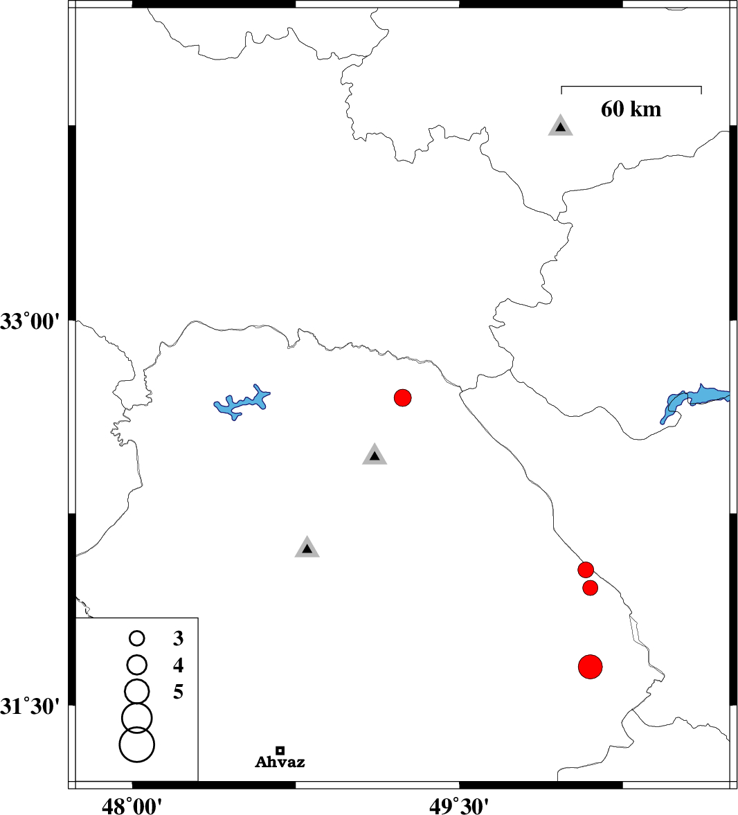 | 2007/11/20 | 05:20:02.8 | 08:50:02.8 | 31.65 | 50.1 | 17 | ML:4.9 | 24 km North-East of Bagh Malek, Khoozestan Province |