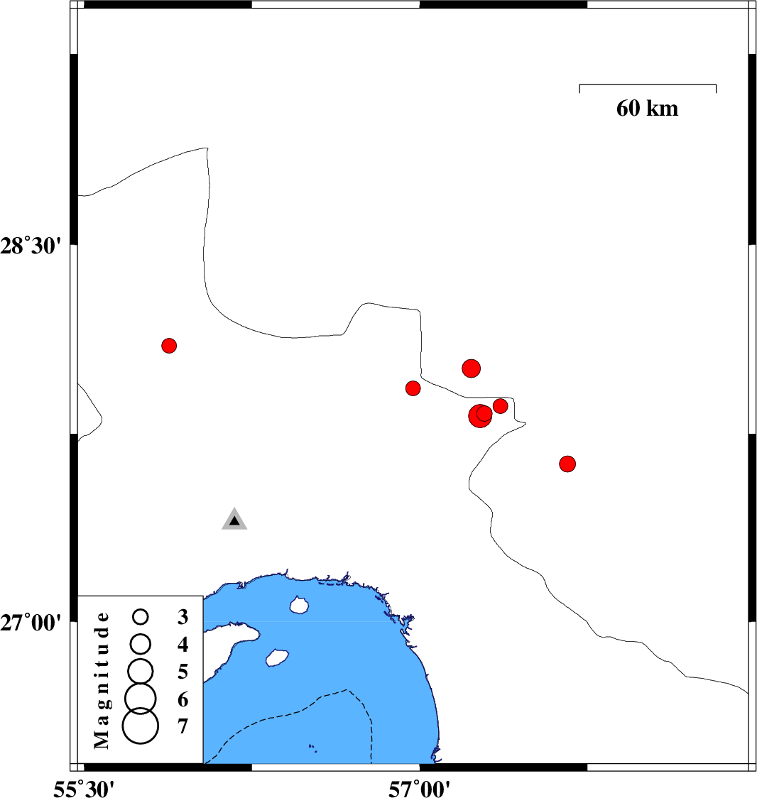 | 2007/11/20 | 23:18:02.4 | 02:48:02.4 | 27.93 | 56.97 | 15 | ML:2.9 | 62 km North-West of Dehbarez, Hormozgan Province | ||