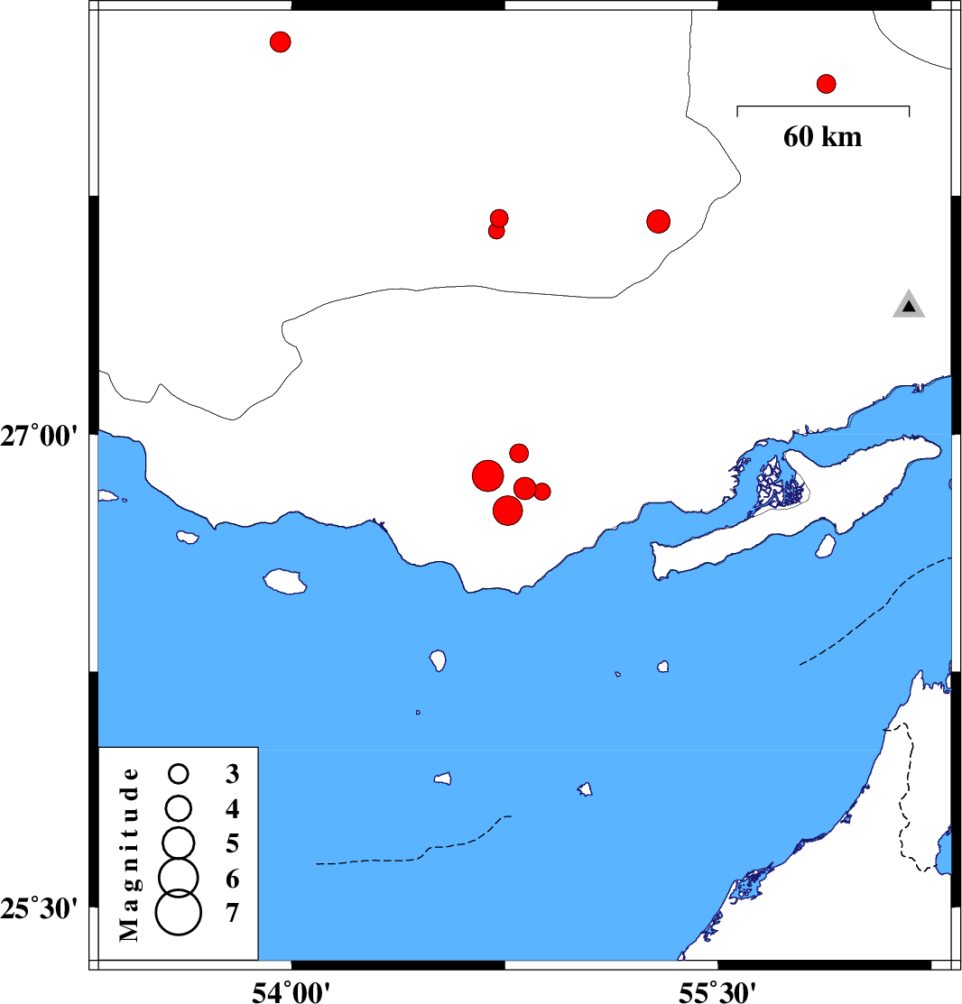2007/11/22 05:45:46.8 09:15:46.8 26.8254.8818 ML:2.7 32 km North of Bandar-e lengeh, Hormozgan Province
