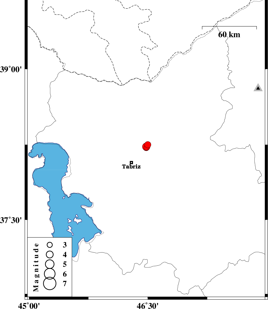 | 2007/12/02 | 10:00:01.4 | 13:30:01.4 | 38.25 | 46.5 | 14 | ML:3.6 | 26 km North-East of Tabriz, Azarbaijan Sharghi Province | ||