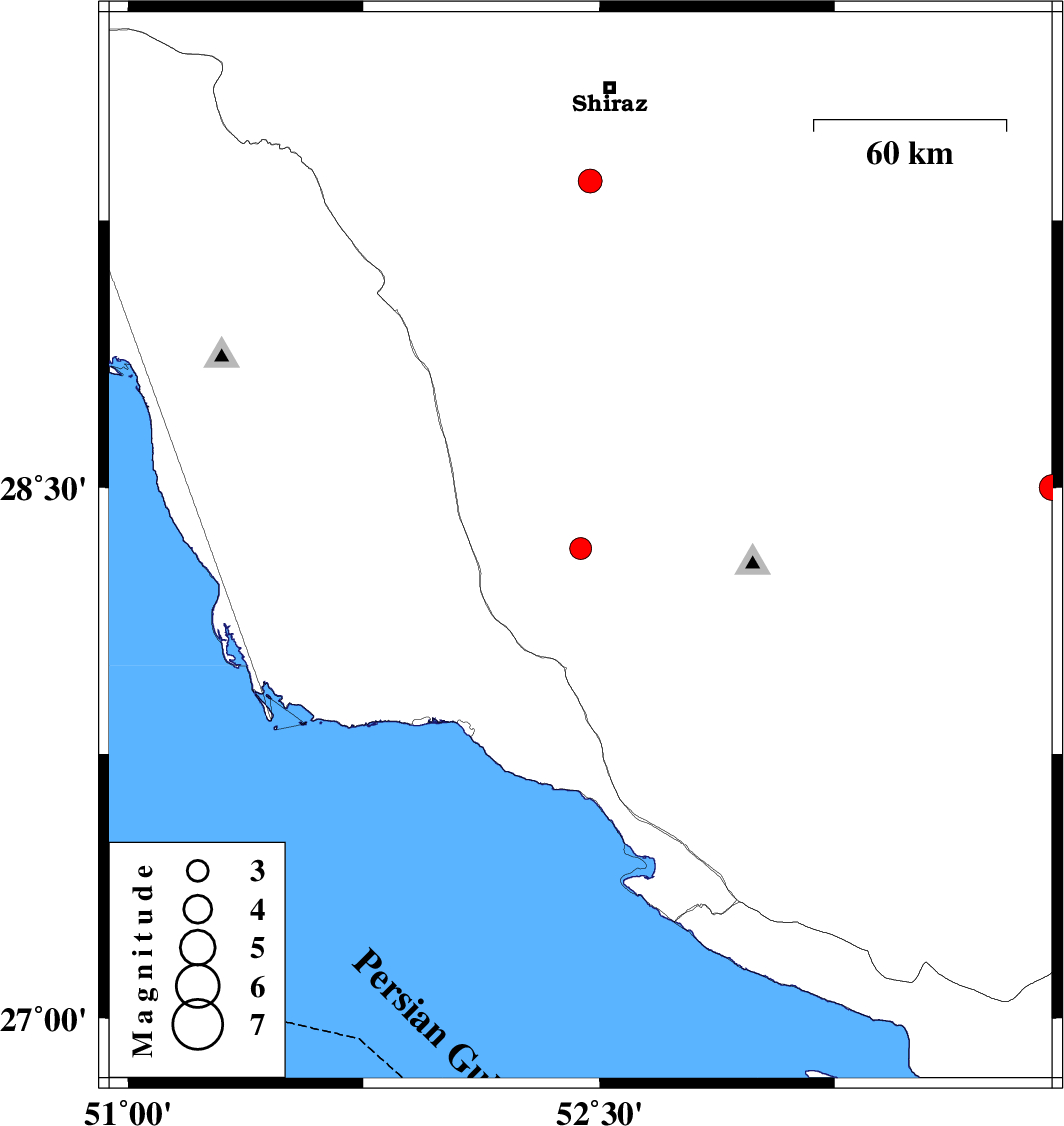 | 2007/11/15 | 02:37:41.1 | 06:07:41.1 | 29.36 | 52.47 | 46 | ML:3.4 | 29 km South of Shiraz, Fars Province | ||