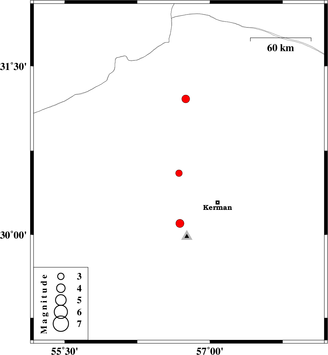 | 2007/12/01 | 16:55:22.5 | 20:25:22.5 | 30.1 | 56.69 | 14 | ML:3.8 | 22 km North-East of Bardsir, Kerman Province | ||