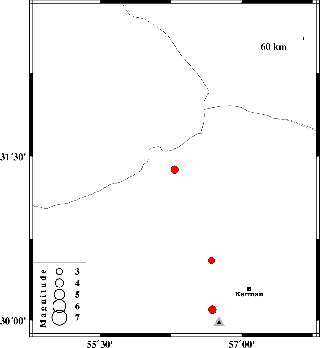 | 2007/12/01 | 16:55:22.5 | 20:25:22.5 | 30.1 | 56.69 | 14 | ML:3.8 | 22 km North-East of Bardsir, Kerman Province |