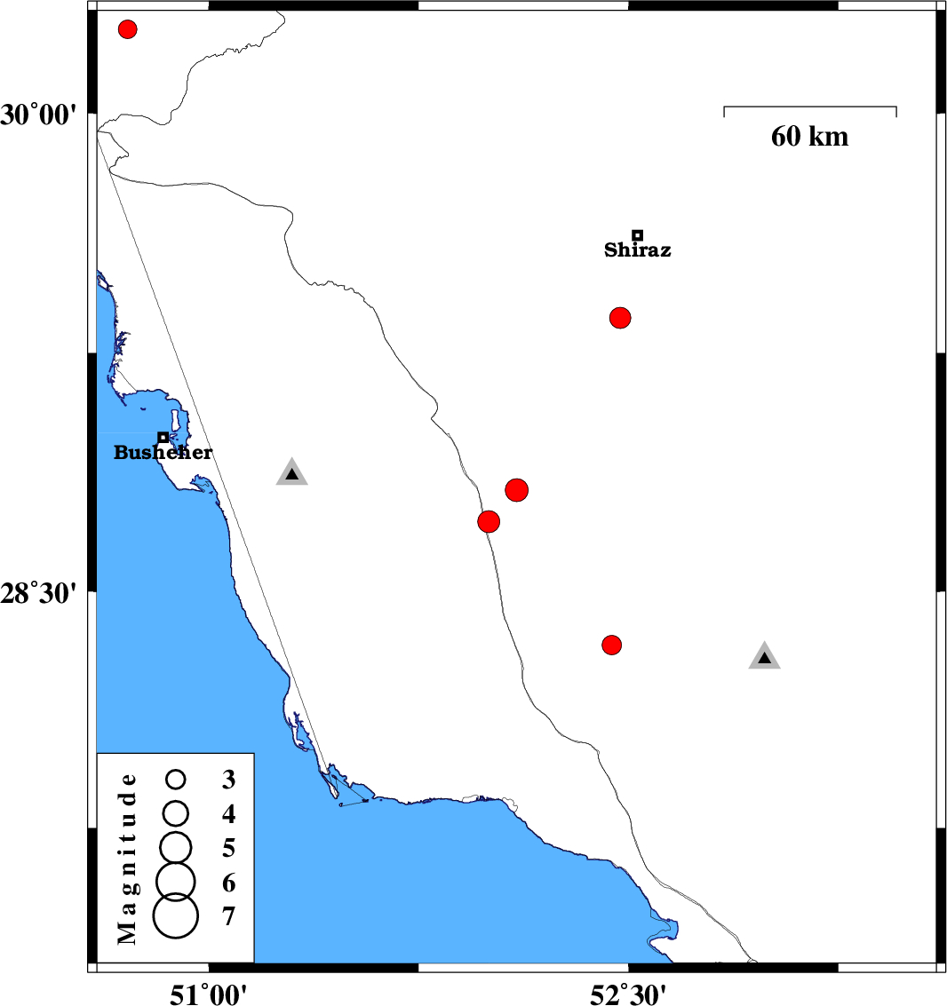 | 2007/11/15 | 02:37:41.1 | 06:07:41.1 | 29.36 | 52.47 | 46 | ML:3.4 | 29 km South of Shiraz, Fars Province |