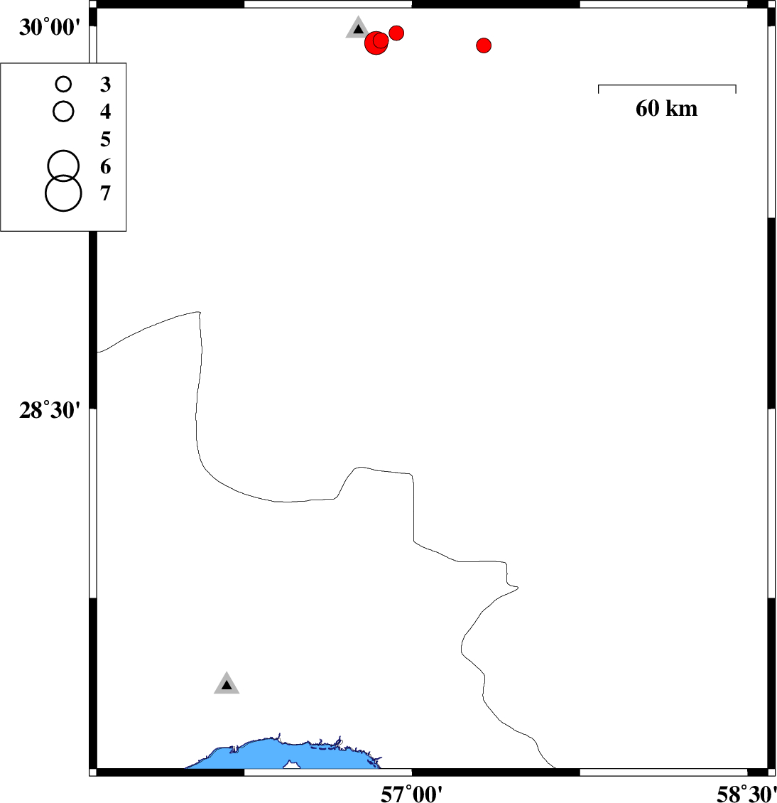 2007/12/09 | 23:43:10.6 | 03:13:10.6 | 28.57 | 57.09 | 17 | ML:2.9 | 63 km South-West of Jiroft, Kerman Province | ||