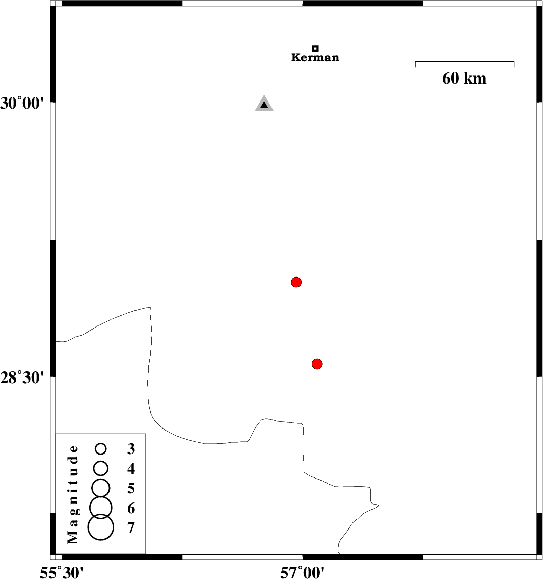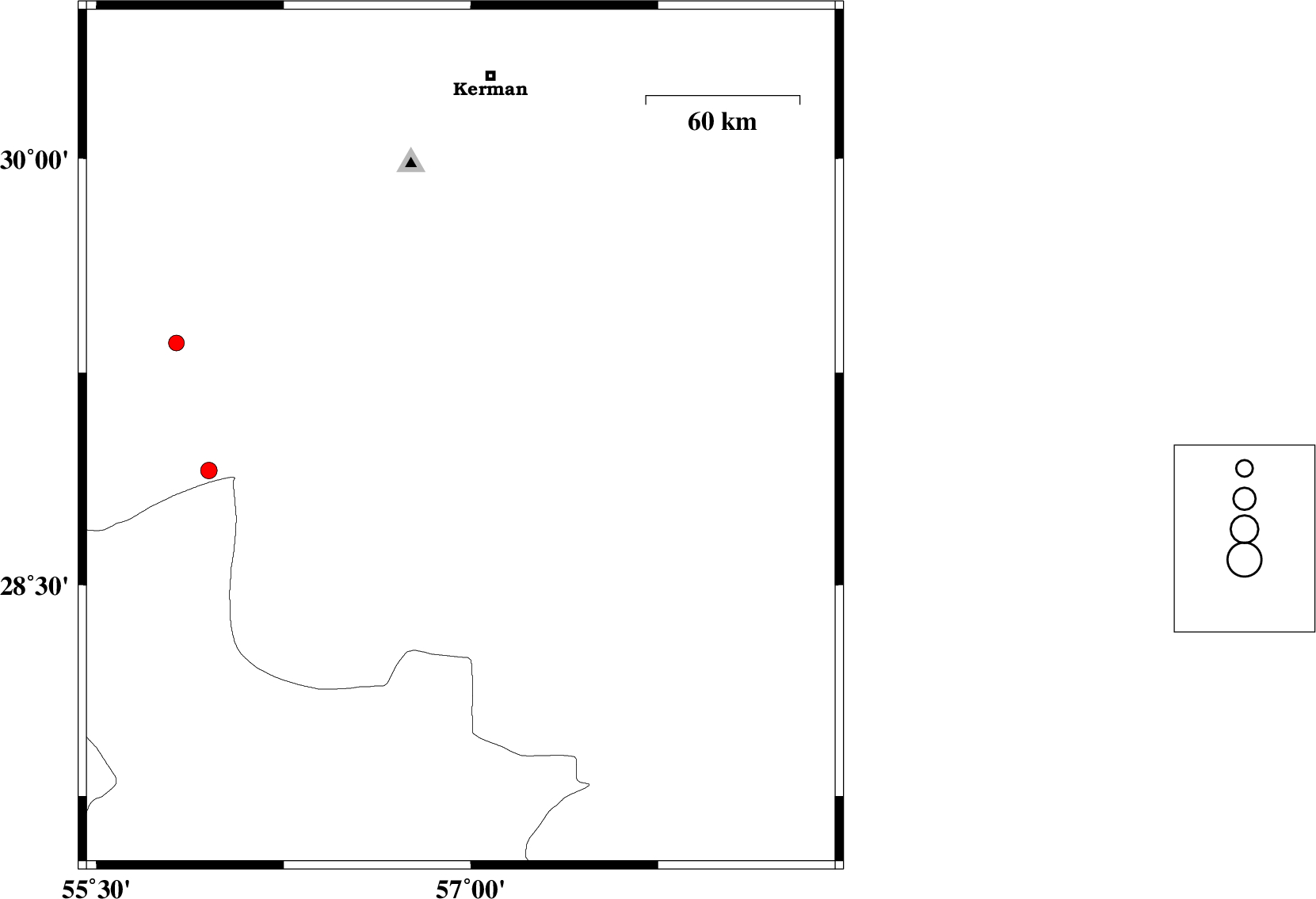 | 2007/12/09 | 23:43:10.6 | 03:13:10.6 | 28.57 | 57.09 | 17 | ML:2.9 | 63 km South-West of Jiroft, Kerman Province |