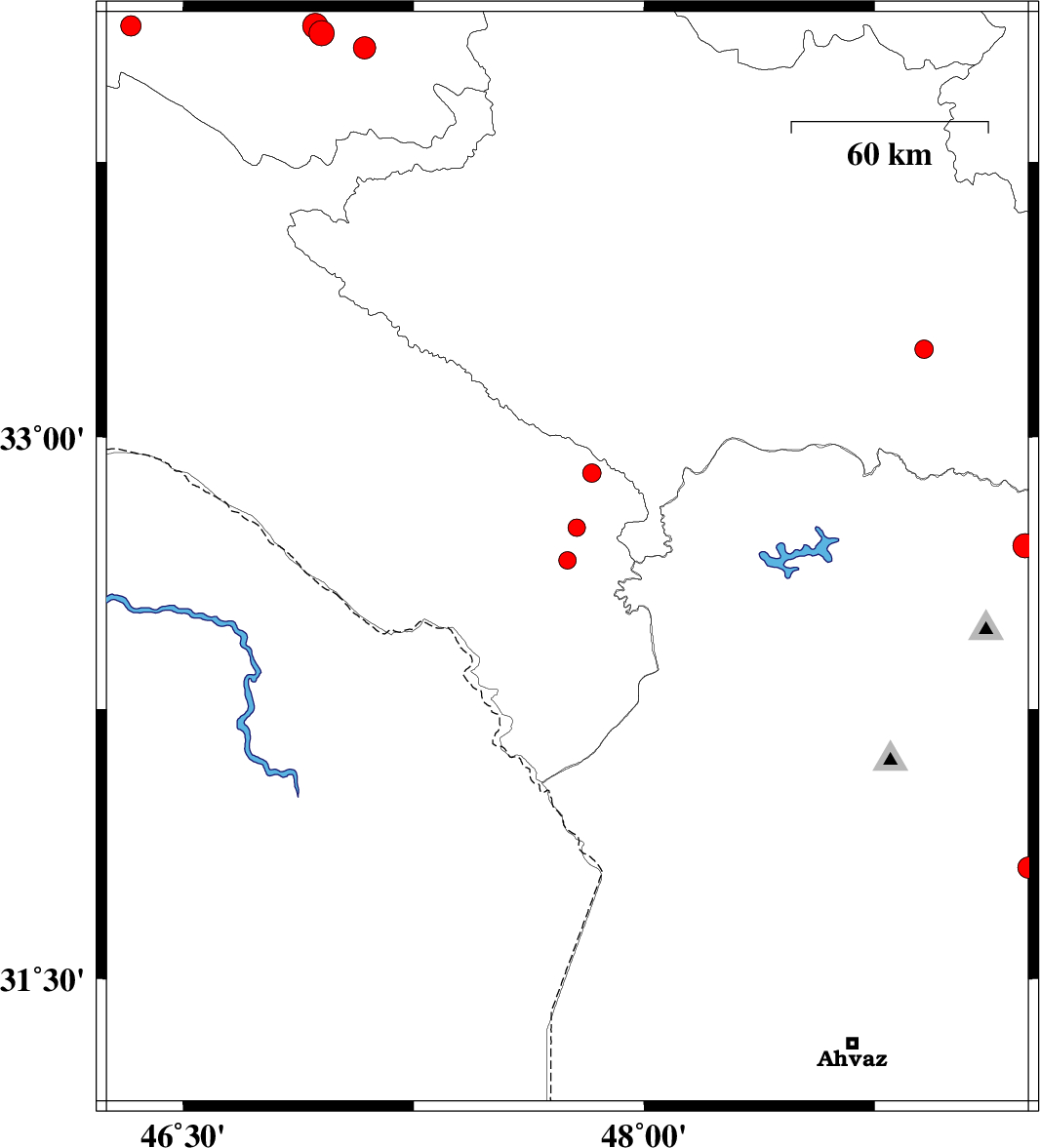 2007/12/12 | 10:04:54.6 | 13:34:54.6 | 32.75 | 47.78 | 18 | ML:2.5 | 35 km South-East of Abdanan, Ilam Province | ||