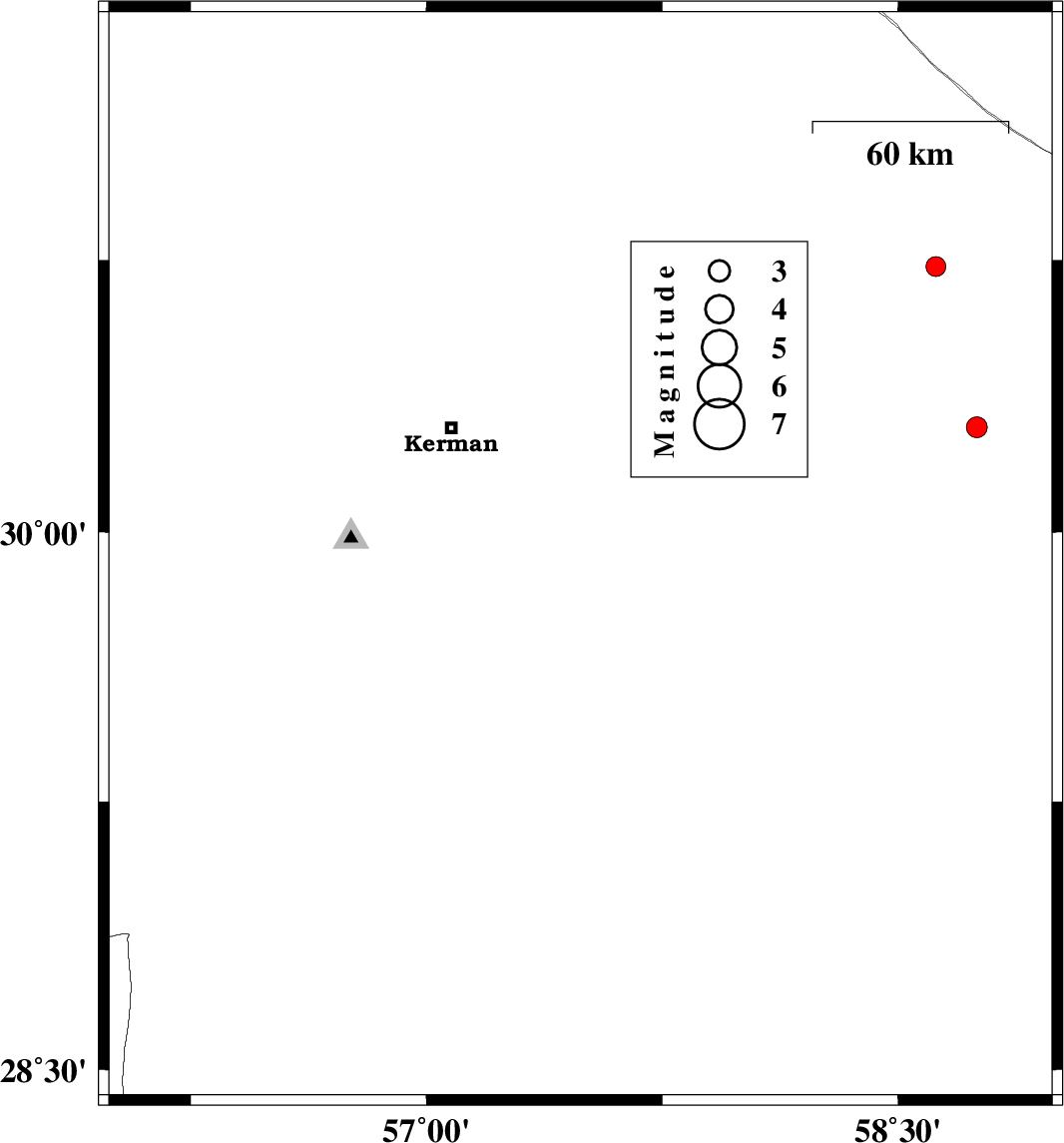 | 2007/12/13 | 01:05:05.1 | 04:35:05.1 | 29.93 | 57.49 | 15 | ML:2.9 | 55 km South-East of Kerman, Kerman Province | ||